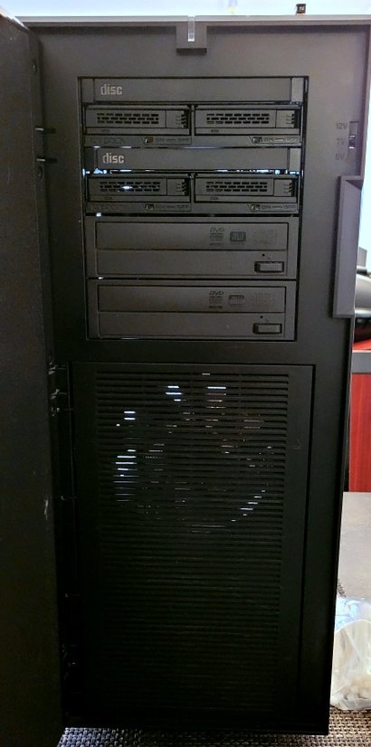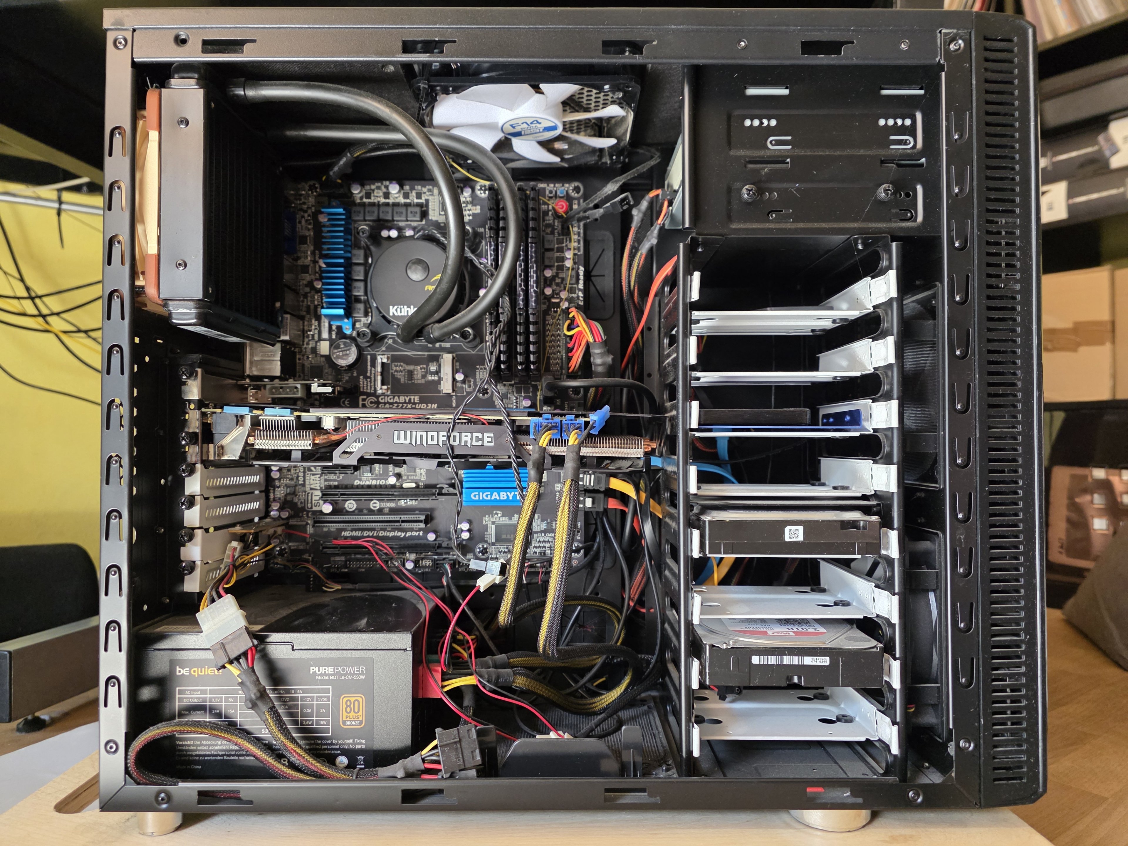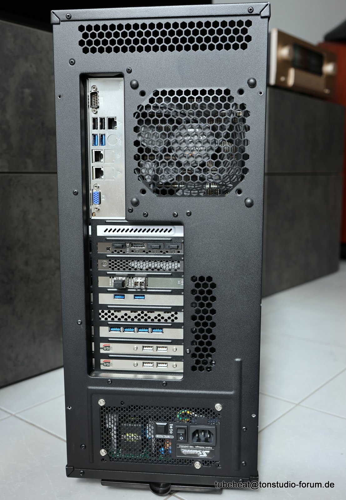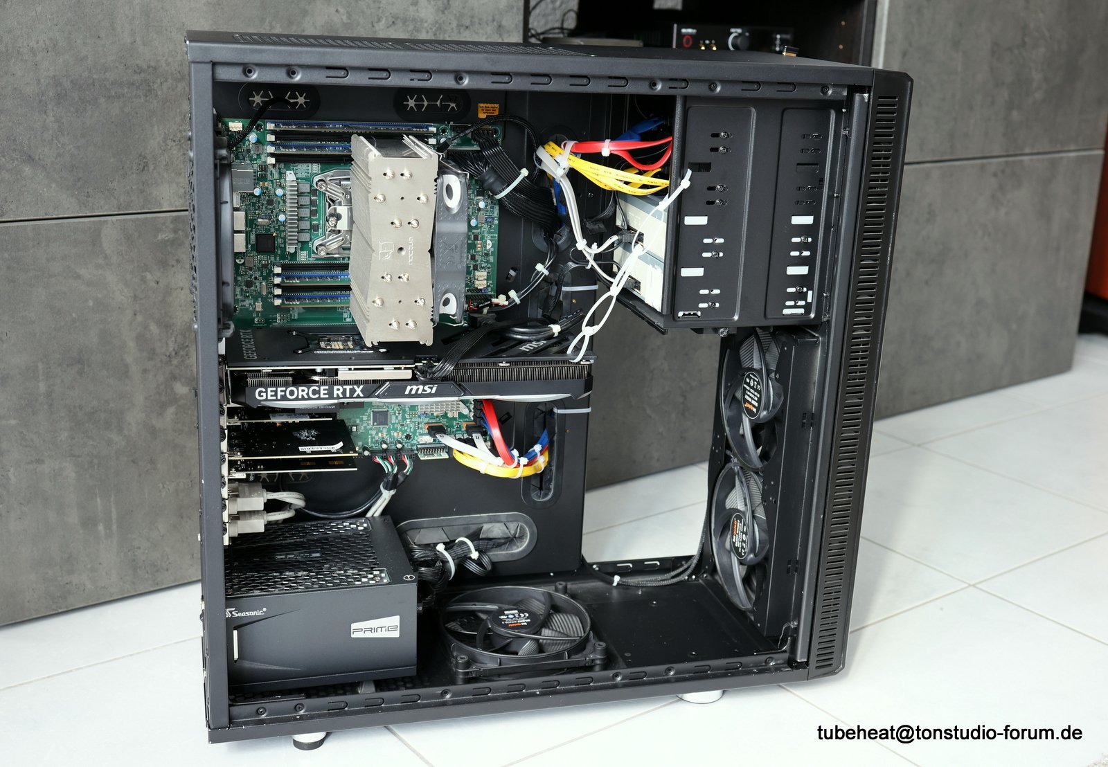 Dabei sind nahezu alle PCIe Slots bestückt, u.a. mit einer 2x 10 Gbit Netzwerkkarte. Auch in den Zeiten, in denen die beiden Laufwerkskäfige noch eingebaut und mit SSDs und Harddisks bestückt waren, gab es keinen Wärmestau.