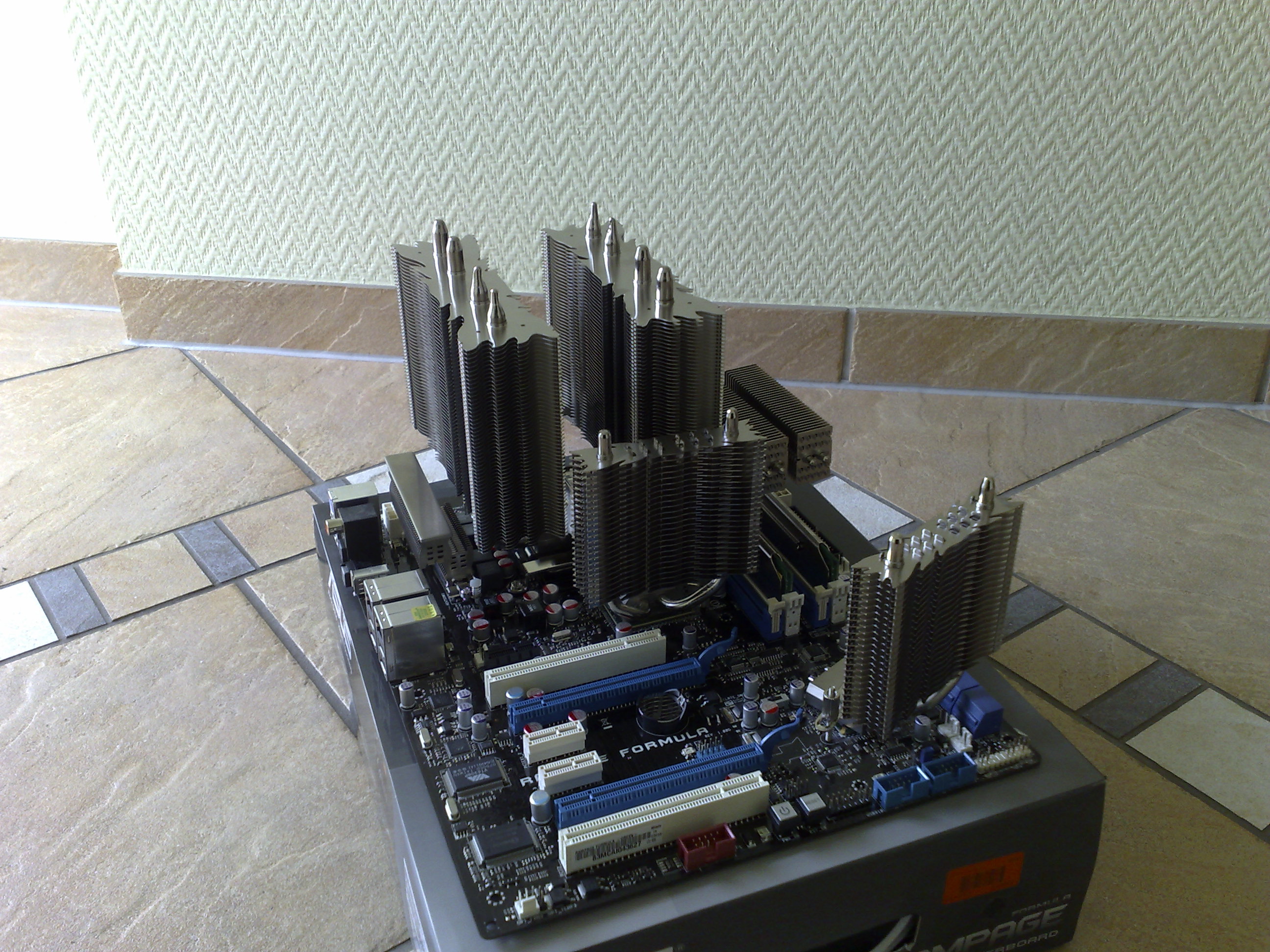 Der HR-10 passt schon lange nicht mehr in einige Gehäuse. Jedoch schien er etwas zu kühlen, da damals (775 mit GA-EP35-DS4 mit Kupferheatpipes im alten Golden Field-Gehäuse (NT oben)) Kondenswasserreste (meine Annahme) auf der Boardrückseite entstanden.