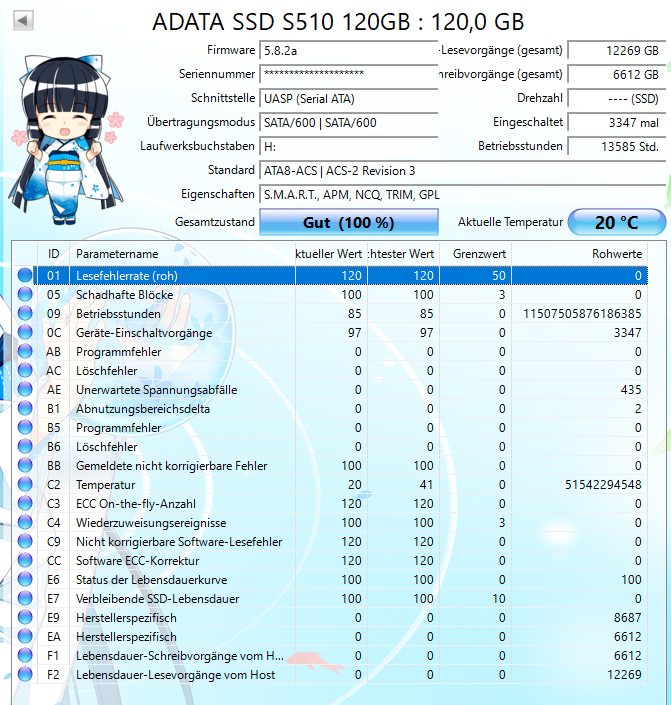Jetzt natĂŒrlich nicht mehr so sehr in Gebrauch. Die SSD brauchte auch damals, warum auch immer, schon mal einen Secure Erase, weil die einfach nicht mehr richtig in die Pötte gekommen ist. Die Smartwerte sehen aber noch gut aus.