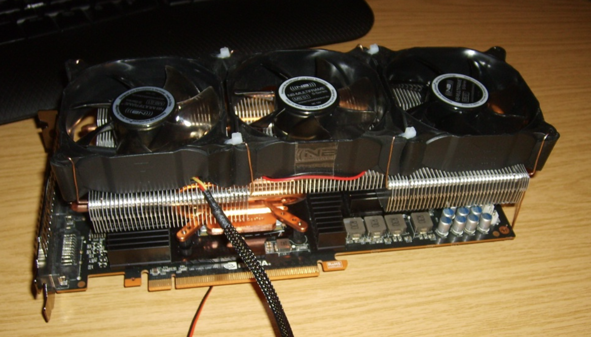 Der für damalige Verhältnisse riesige 3-Slot-Kühler konnte selbst die notorisch heiße (und übertaktete) "Thermi"-GPU in Schach halten.