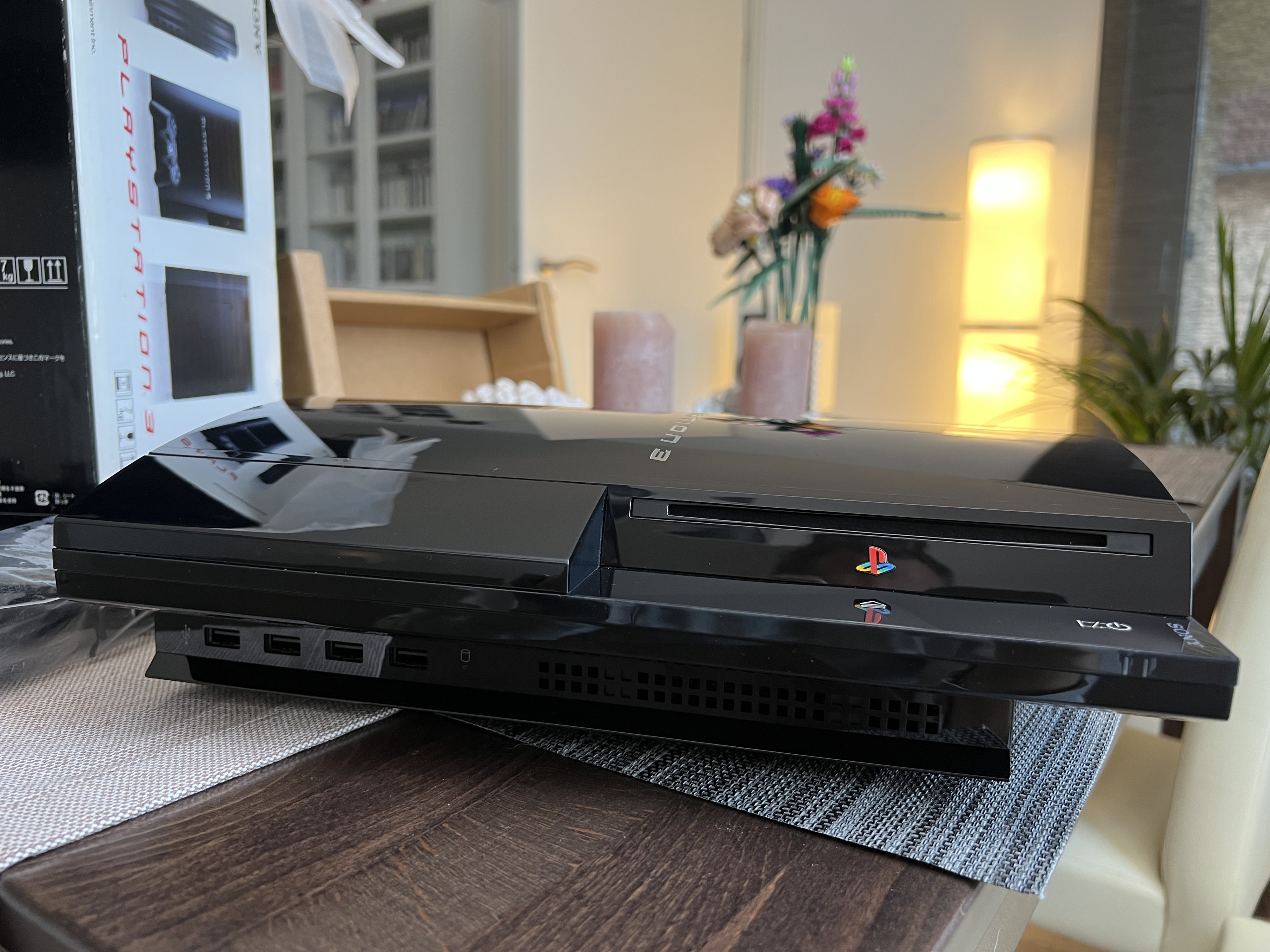 Sie sehen hier eine Playstation 3, so wie sie erstmalig auf dem japanischen Markt erschien. Ein komplett schwarzes 20 GB Modell (CECHB-00). Dieses Gerät ist voll in Hardware zur PS2 abwärtskompatibel (das europäische 60 GB Modell ist es entgegen der weitläufigen Meinung nicht). Details dazu hier https://www.psdevwiki.com/ps3/Motherboard_Revisions.