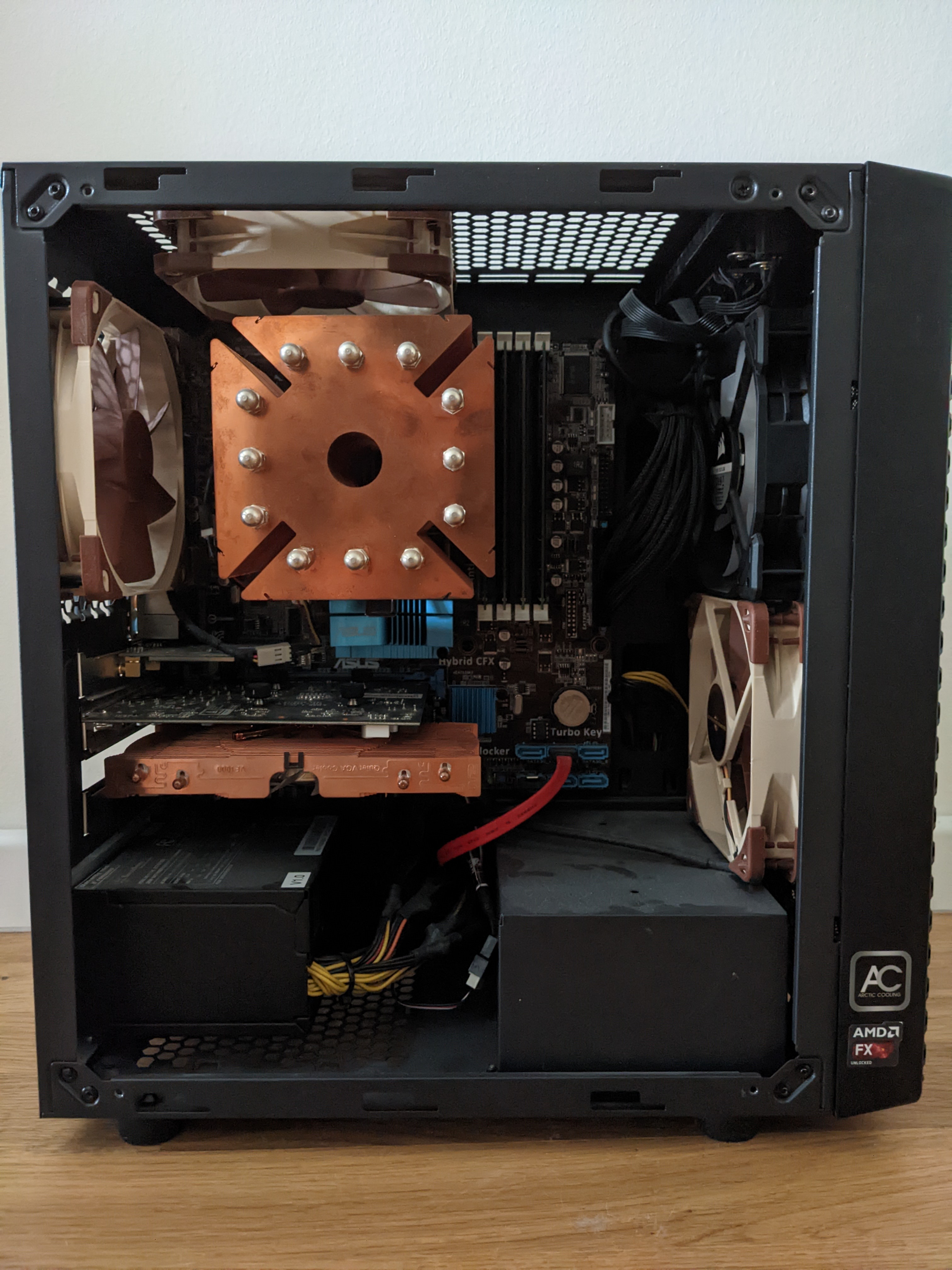 Also in der Konfiguration mit den zwei Gehäuselüftern (@700rpm) und dem FX@3,8@1,212V (schätze knapp 85W Verbrauch) + liquid Metal wird die CPU im mprime 55°C warm laut hwinfo (small fft).