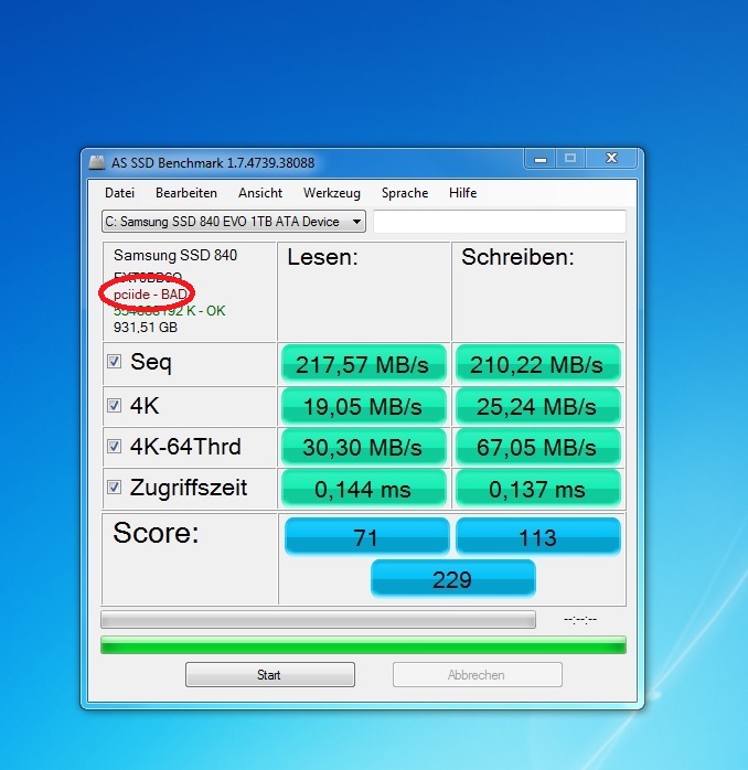 Hi Leute. Ich habe meinem in die Jahre gekommen iMac eine SSD Samsung 840 Evo 1TB gespendet um ihn ein wenig flotter zu machen. Wenn ich über Mac 10.9.4 nen SSD Test mit Black Magic mache komme ich auf gute 280 MB Lesen und schreiben und auch die 4k Test werte sind auch sehr sehr hoch, jetzt fragt mich nicht wie hoch dazu müsst ich neustarten und den Test nochmal machen. Jetzt ist es so das ich zum Spielen mir eine Windows 7 Bootcamp partion gemacht habe und da fehlt mir anscheinend der AHCI Modus denn meine Werte mit AS SSD Benchmark sehen schrecklich aus und als ich eben beim laden in einem Game extrem lange dafür gebraucht habe kam mir das schon sehr sehr merkwürdig vor. Jetzt habe ich eins zwei Tutorials gefunden wie man für nen Mac Book 2009 und 2011 den AHCI Modus aktiviert aber kein für den iMac. In dem Bild ist zu sehen das Der AHCI Modus aus ist und deshalb die Meldung pciide - BAD kommt. Wie bekomme ich den AHCI Modus zum laufen ?