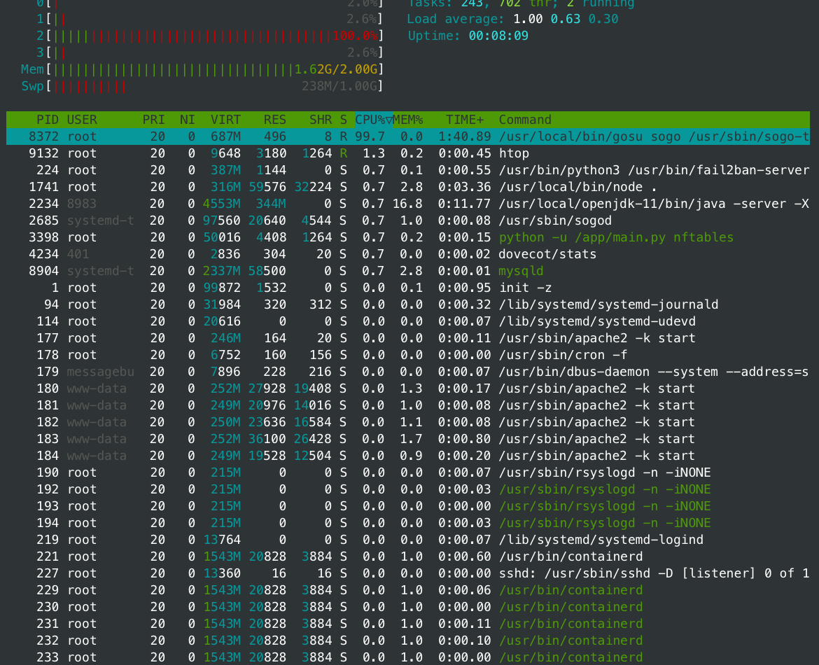Was ich auf den ersten Block sehe ist, dass du 2GB Ram für das ganze System hast und SWAP bereits ordentlich genutzt wird. Es würde mich nicht wundern, wenn das Programm hauptsächlich damit beschäftigt ist irgendwie um den sehr knappen Speicher herumzuarbeiten, während das OS versucht Mailcow, Apache und Java im Speicher zu sortieren.