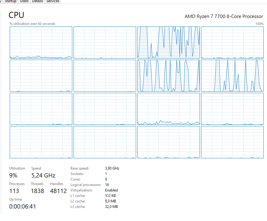 Im normalen Desktopbetrieb (Dateien, Browser etc) habe ich immer so um die 40 Grad - Aber es werden immer die 3 selben Kerne (CPUs 2, 6 und 7 - Bezeichnung im Taskmanager) genutzt unabhängig davon welche Programme genutzt werden.