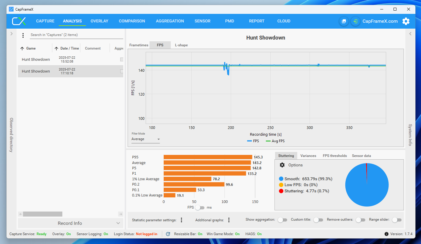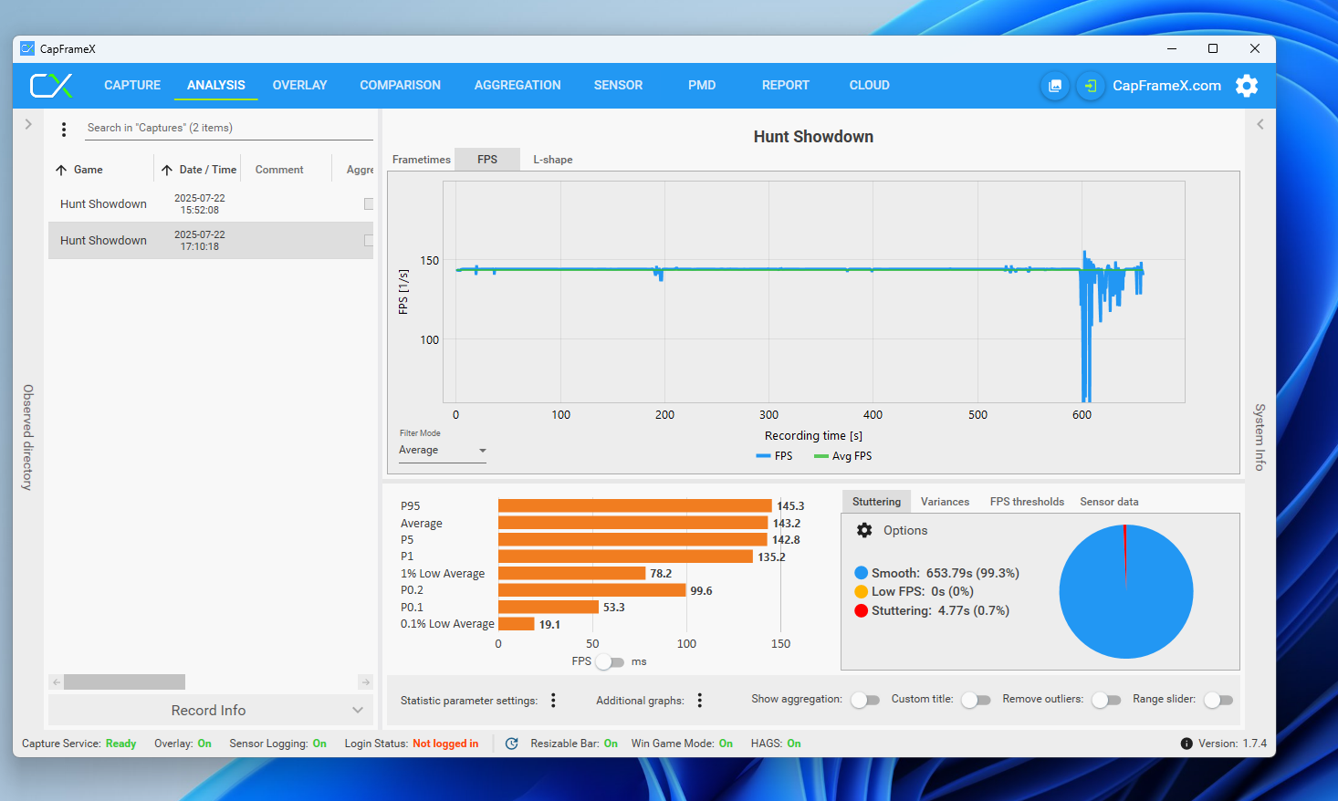 Ich habe bei einer Runde mal CapFrameX laufen lassen dabei ist aber zu beachten , dass ab ca Sekunde 570 nicht ingame war sondern das ich aus dem Spiel gegangen bin .