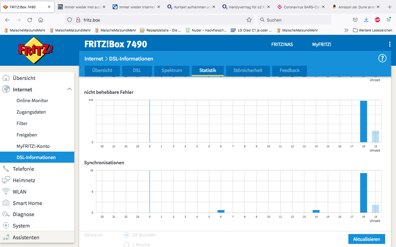 In unregelmäßigen Abständen habe ich kein Internet und die DSL Leuchte am Router blinkt. Manchmal dauert es nur ein paar Sekunden bis wieder eine Verbindung kommt, manchmal eine halbe Stunde, manchmal läuft es für ein paar Minuten und bricht wieder ab und läuft wieder bricht ab ...