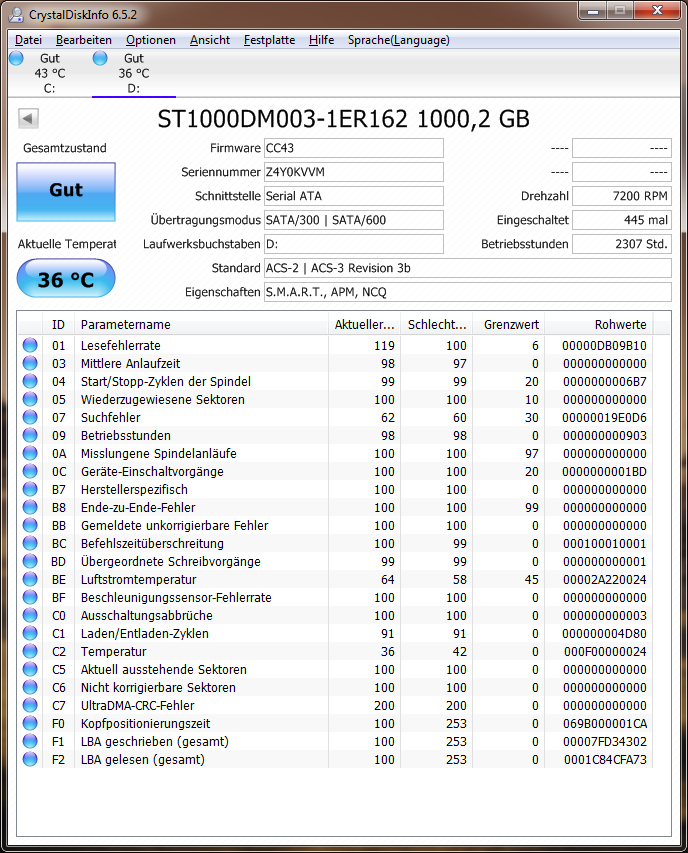 Weiterhin bescheinigen sowohl die Seagate Seatools (Langzeittest, Lange Reparatur) als auch CrystalDiskInfo der Platte eine gute Gesundheit. Defekte Sektoren o.ä. also bis dato Fehlanzeige.