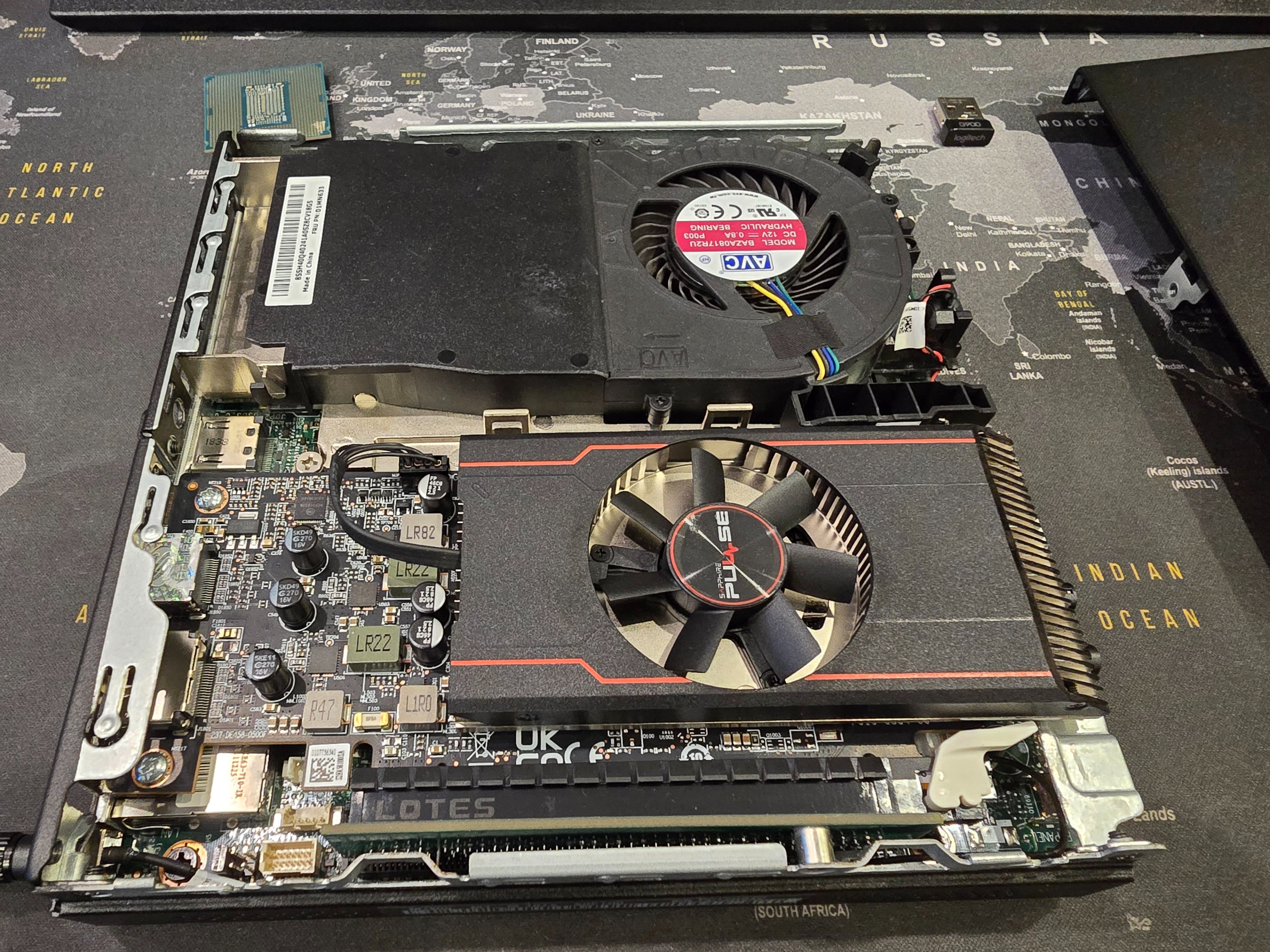 (Das Bild mit offenem Gehäuse zeigt noch die alte AMD RX6400 GPU - diese wurde ersetzt vor längerer Zeit durch die RTX3050)