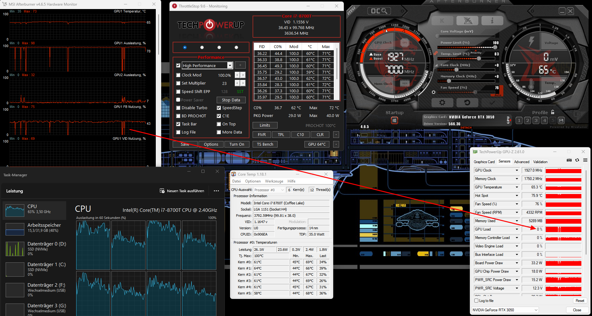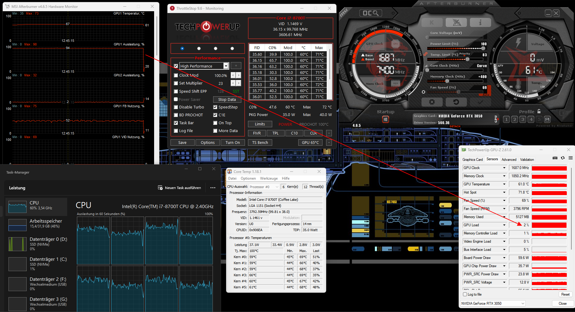 Die RTX3050 wird aktuell von einem 120mm Lüfter zusätzlich gekühlt und sämtliche Treiber sind aktuell.