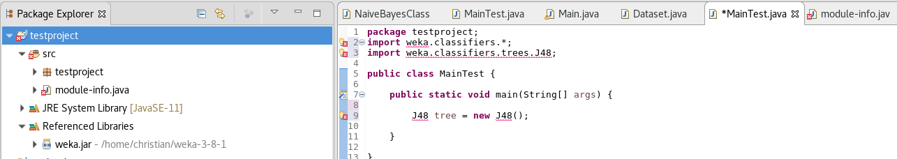 ich habe wie ich es seit jeher gewohnt bin externe Libs über Build Path => Configure Build Path das externe JAR weka.jar in Eclipse integriert. Jetzt ist es auch erwartungsgemäß unter Referenced Libraries meines Projektes eingetragen. Dennoch kann ich keine Instanzen von Klassen aus weka.jar verwenden. Bereits das Eintragen der import-Klausel verursacht eine Fehlermeldung vom Compiler (the type weka.classifiers.trees.j48 is not accessible).