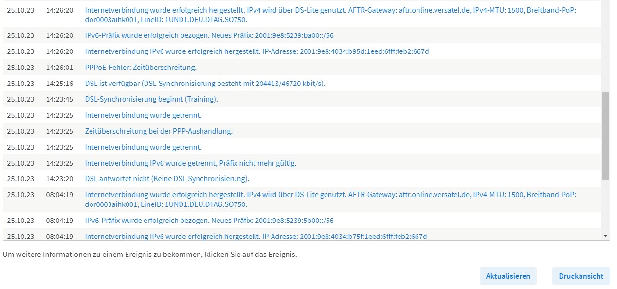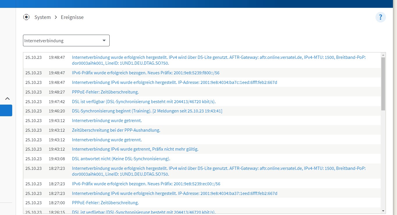 Die entscheidende Meldung in den Ereignissen der Fritzbox ist "DSL antwortet nicht (Keine DSL-Synchronisierung)." und zusätzlich die Meldung "PPPoE-Fehler: Zeitüberschreitung" bzw. "Zeitüberschreitung bei der PPP-Aushandlung.".