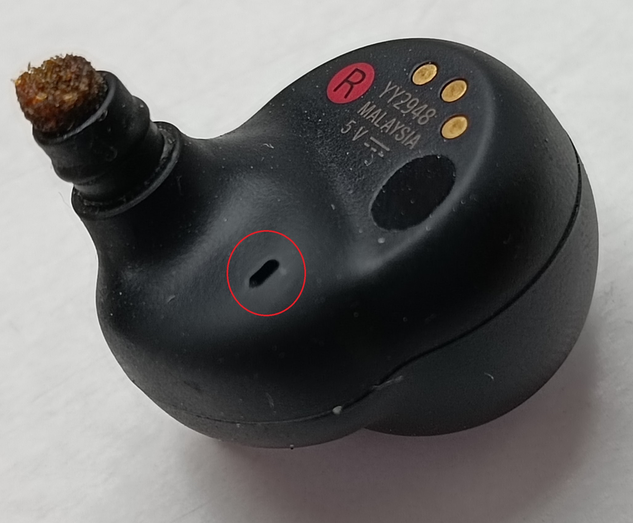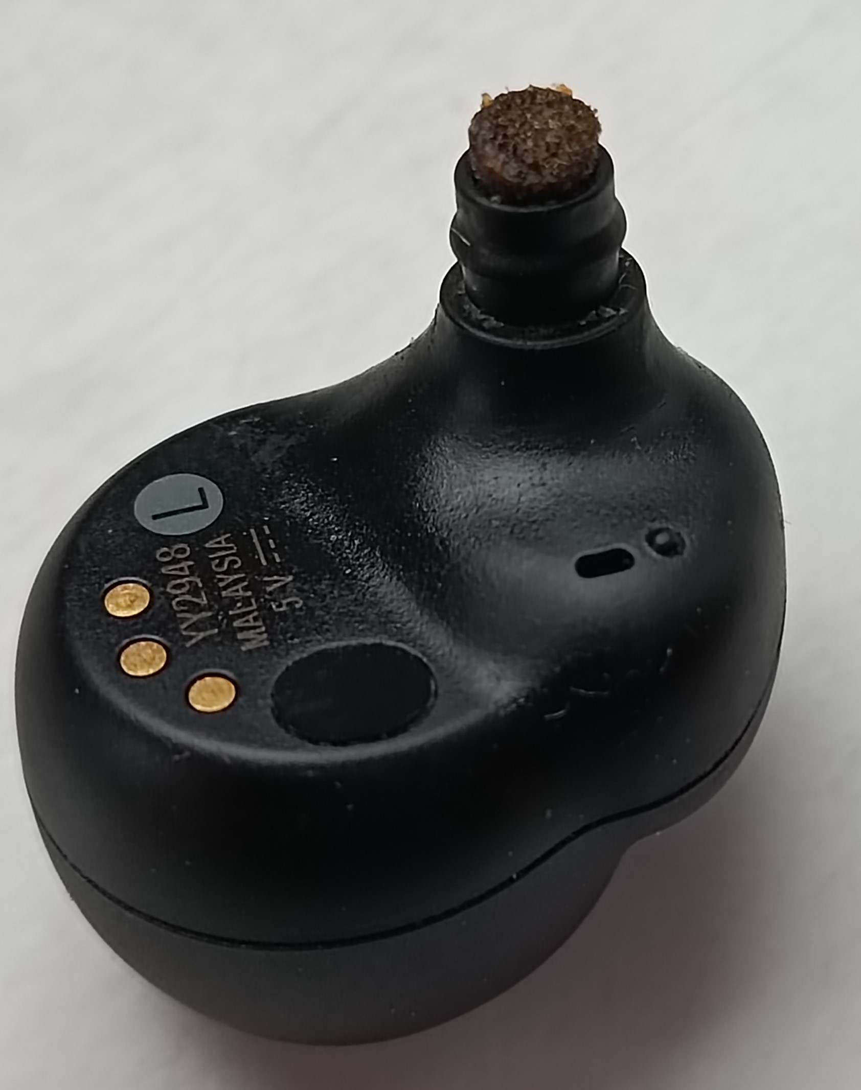 Dieser längere Kanal, in dem sich der Ohrenschmalz normalerweise ansammelt, existierte dann nicht mehr und der Ohrenschmalz wurde direkt in die Schallauslassöffnungen gedrückt. Da ist so ein kleines Metallsieb/ Stahlwolle.