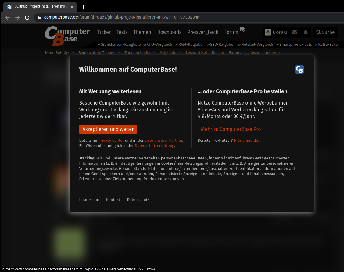 Schaut bitte mal nach, ob ein installiertes Add-on dazwischenfunkt, indem es das Laden der im Hintergrund arbeitenden Consent-Management-Platform (CMP) blockiert. Die wird von cookielaw.org geladen.0x8100 schrieb:der dialog kommt bei JEDEM link und die links innerhalb des dialogs auf "privacy center" und "liste unserer partner" funktionieren nicht...