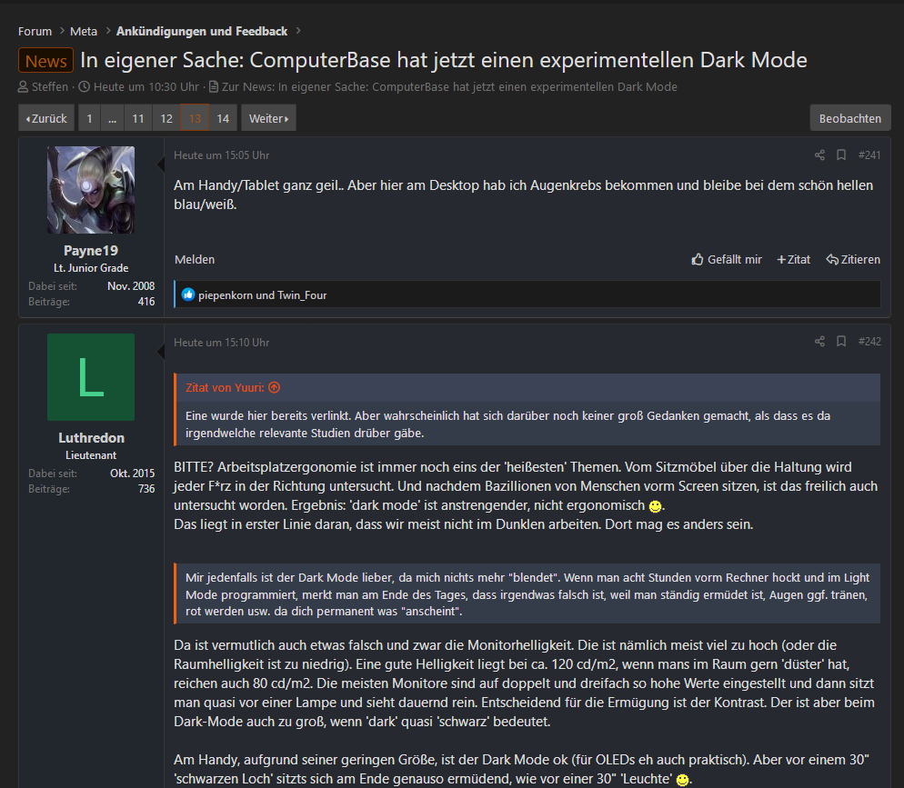 Ja sehr geil. Ich nutze immer und überall einen Dark Mode, wenn es einen gibt. Für Seiten wie CB, die sehr hell/weiß nutze ich immer das "Darken" Browser-Add-On. Ein nativer Dark Mode ist aber natürlich immer besser.
