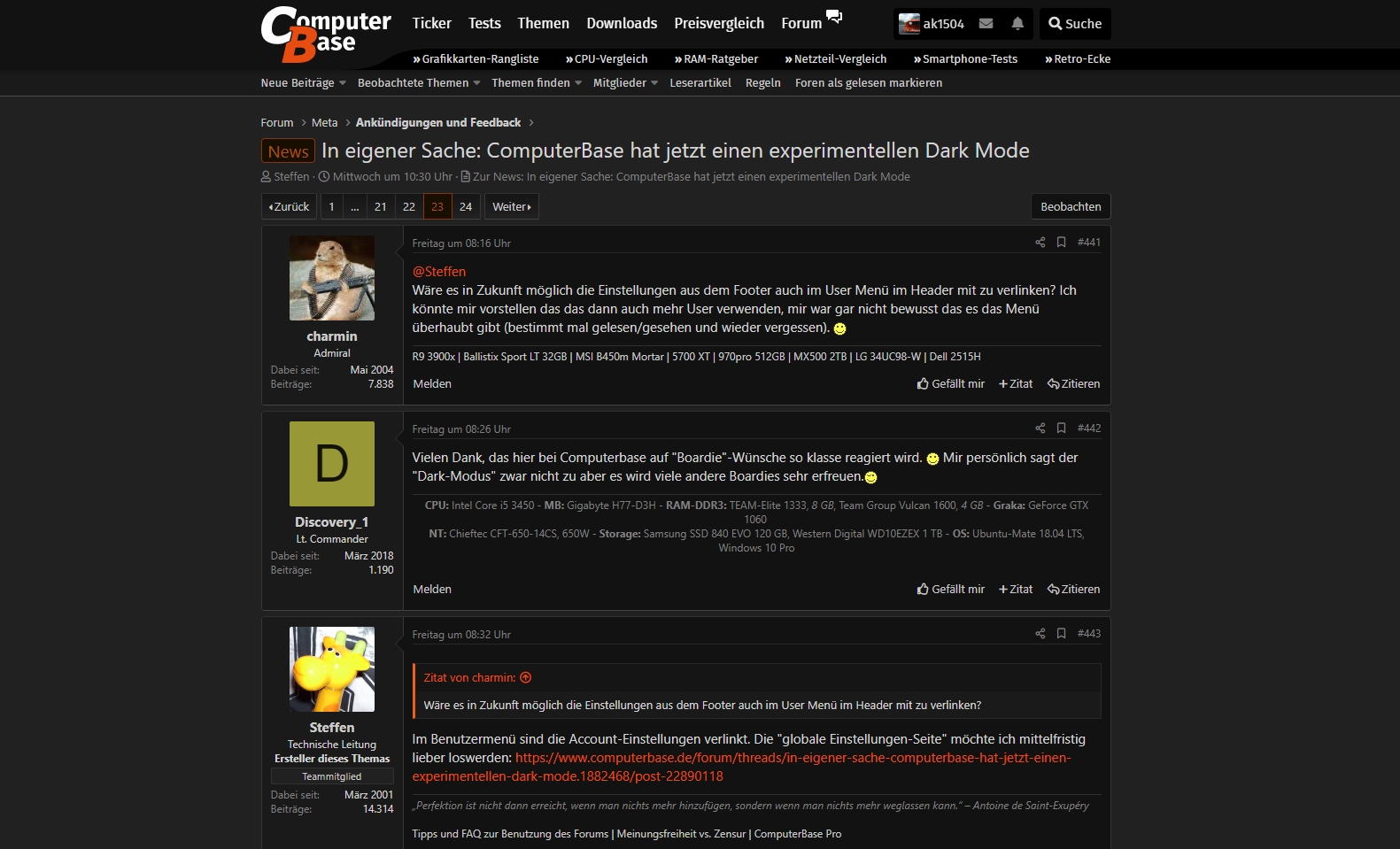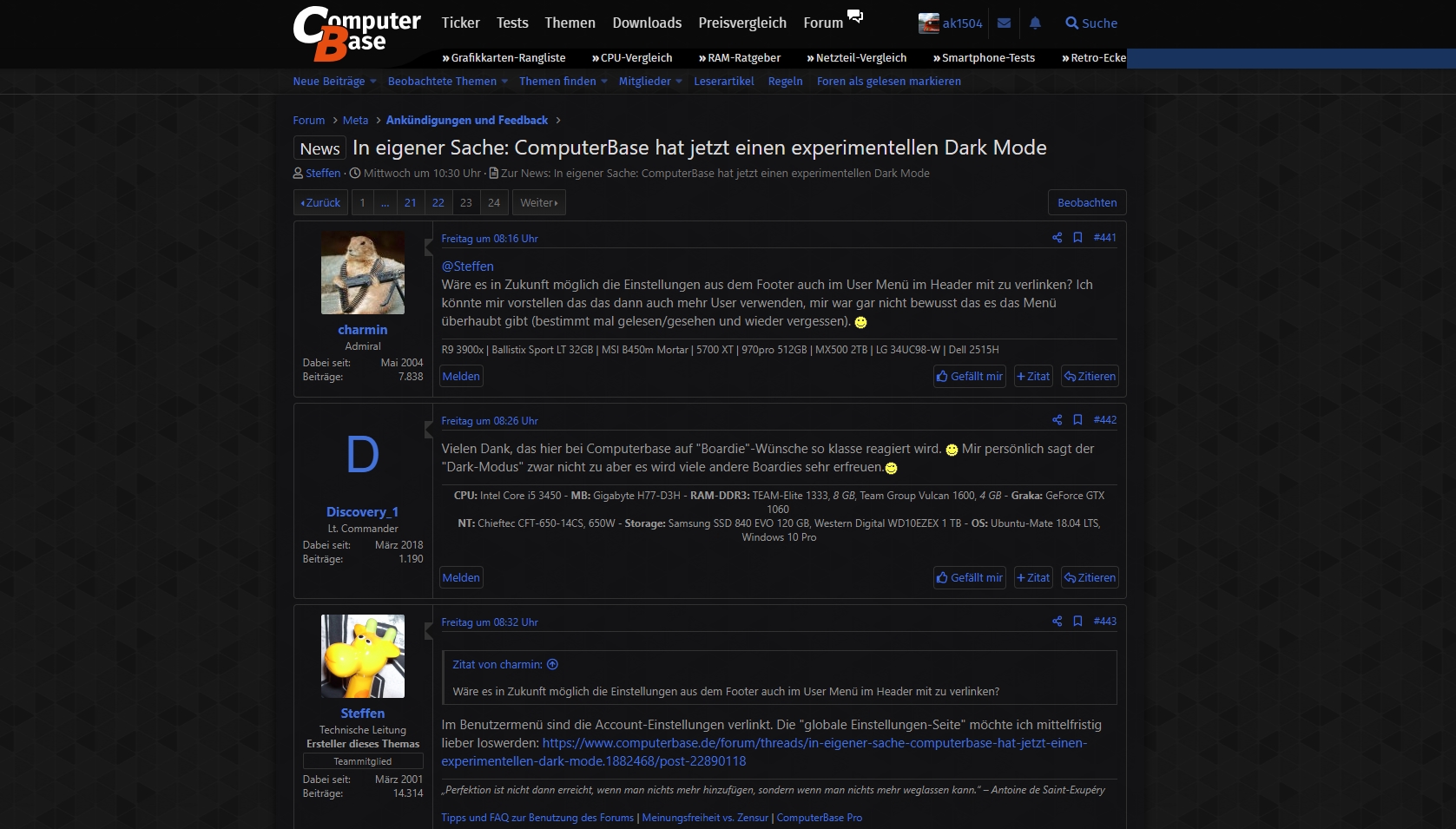 Der Dark-Mode ist noch nicht final und der technische Unterbau wird sich wie du oben lesen kannst nochmal verändern (wenn Steffen wieder zurück ist). Bis dahin kannst du vielleicht eine Ausnahme für die Cookies von ComputerBase bzw. nur den Dark-Mode Cookie anlegen? Das sollten alle aktuellen Browser unterstützen.Der Plan ist, den Dark Mode von ComputerBase zukünftig automatisch genau dann zu aktivieren, wenn der Browser beziehungsweise das Betriebssystem einen Dark Mode nutzen. Das erfordert allerdings sehr neue Browser/Betriebssysteme und zuvor soll der Dark Mode von ComputerBase noch ausgiebig getestet werden.