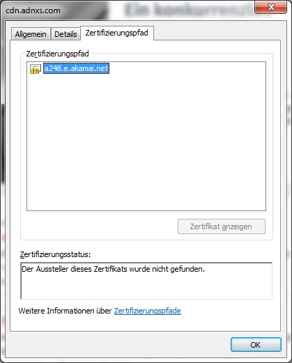 Könnt ihr vielleicht noch zwei Screenshots den Fenstern machen, die beim Klicken auf "Details" und "Zertifikat anzeigen" erscheinen? Ich vermute das könnte beim Finden der Fehlerursache helfen.