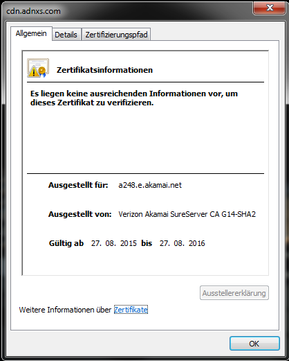 Eine Google-Suche deutet darauf hin, dass Akamai das eigene SSL-Setup nicht im Griff hat (http://www.zdnet.com/article/akamais-https-fail-sets-a-bad-example/). Wenn dem so sein sollte, dann wäre das ziemlich peinlich für ein globales CDN. Aber warten wir ab. Update: Der Fehler liegt wahrscheinlich nicht bei Akamai, sondern bei dem technischen Dienstleister unseres Vermarkters.