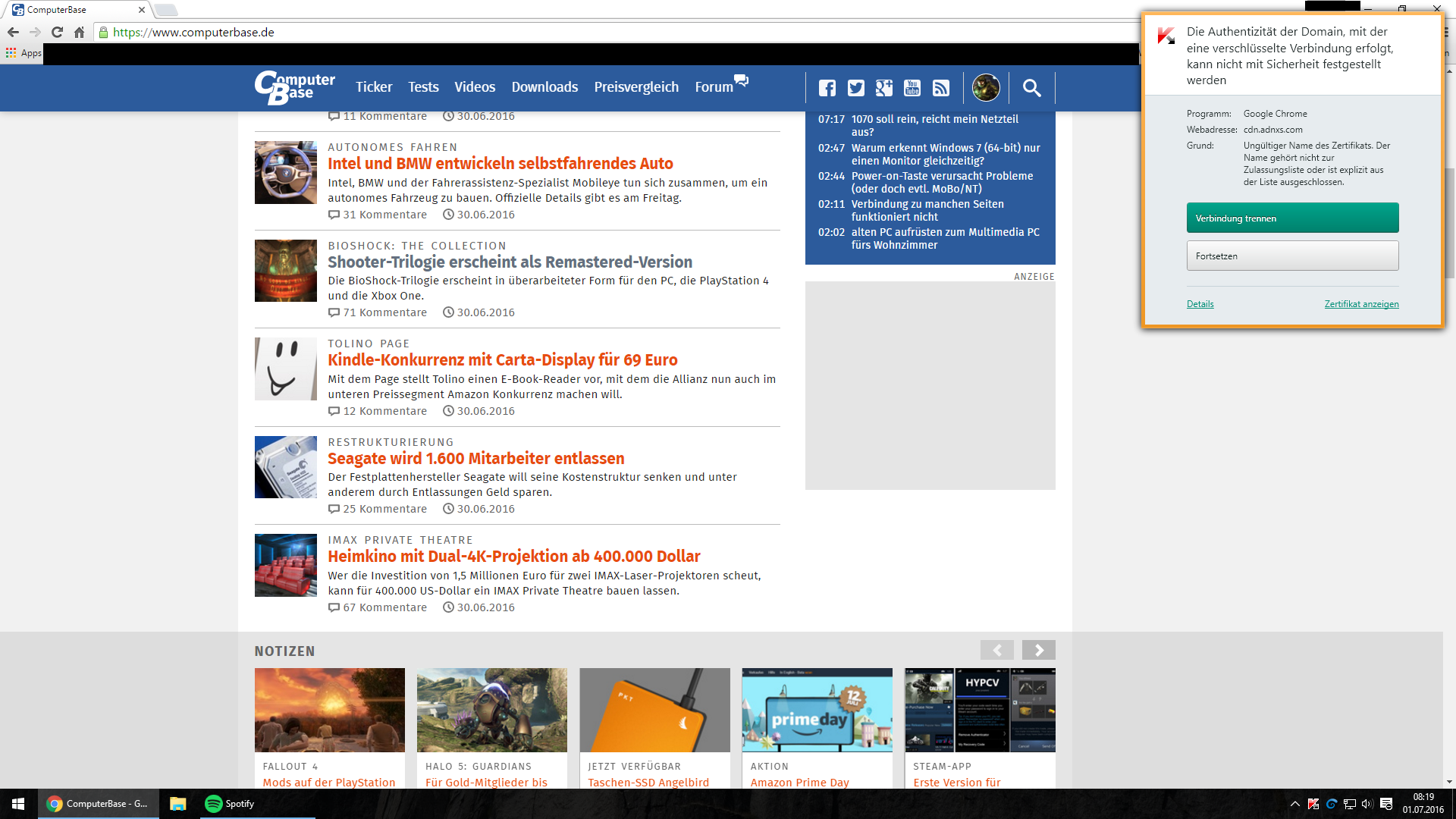Unser Vermarkter greift zum Ausliefern der Anzeigen auf einen technischen Dienstleister zurück, der unter anderem die Domain cdn.adnxs.com nutzt. Beim Laden von Anzeigen von dieser Domain via HTTPS liefert der zuständige Server manchmal (unabhängig davon, ob Kaspersky installiert ist) ein falsches SSL-Zertifikat aus. Normalerweise würde ein Browser in einem solchen Fall das Laden der Anzeige von cdn.adnxs.com einfach still abbrechen, d.h. im konkreten Fall diese Anzeige nicht laden und lediglich einen Fehler in der Entwicklerkonsole loggen. ComputerBase wäre nutzbar, der Nutzer würde weder einem Sicherheitsrisiko ausgesetzt noch würde er genervt und es würden lediglich ein paar Anzeigen fehlen.