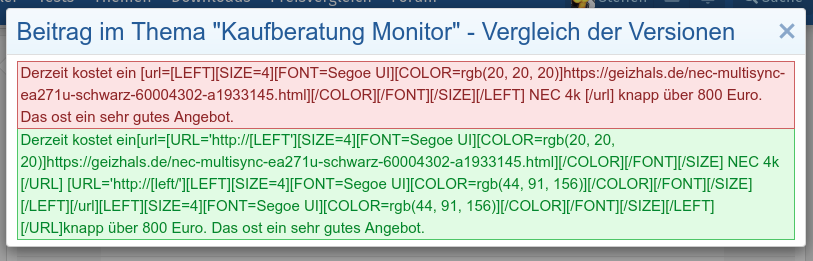 Aber: Von den im CB-Archiv sichtbaren zusätzlichen BBCodes war bei mir im Editor (also im Fenster, das sich nach "Bearbeiten" öffnet, NICHTS zu sehen, also keine Size-, Font-, Color- etc. Angaben. Ausser dem bereits erwähnten