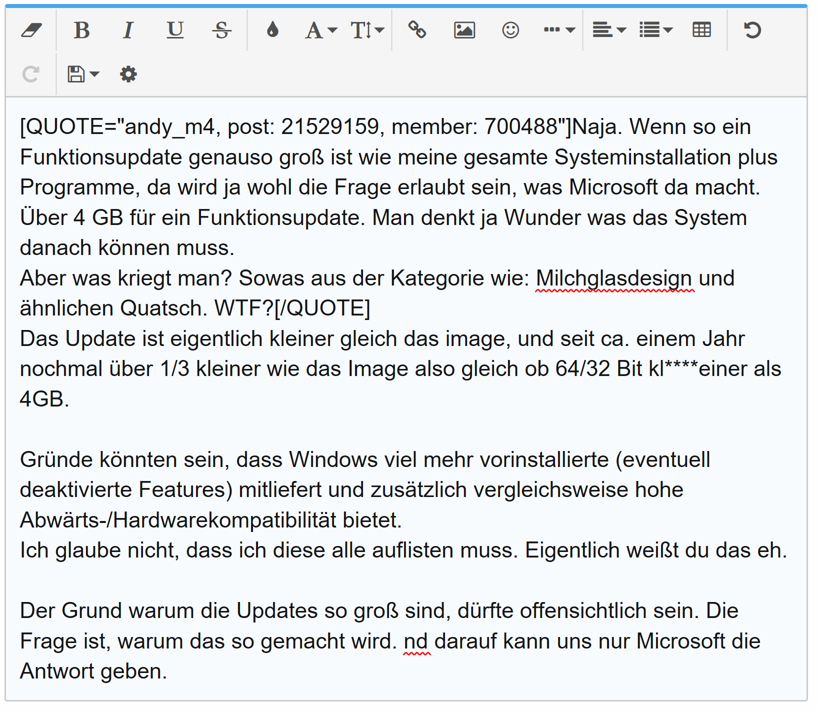 @new Account() Es gibt einen Bug, aufgrund dessen beim Löschen des letzten verbliebenen Zeichens einer Zeile via Backspace auch der unmittelbar voranstehende Zeilenumbruch gelöscht wird. Der Bug ist in Froala (dem von XenForo genutzten WYSIWYG-Editor) seit ein paar Wochen behoben, d.h. im nächsten XenForo-Release sollte er verschwunden sein. Vielleicht hängt der von dir beobachtete Bug damit zusammen.