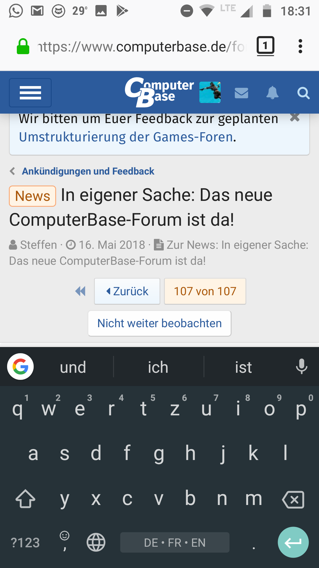 Das hat also denke ich alles korrekt funktioniert. Eine Ergänzung führt (wie eine normale Antwort) nur dann zu einer Benachrichtigung, wenn der nicht-ergänzte Beitrag zuvor gelesen wurde. Dafür hatte ich am 9. Mai (also noch vor dem Launch) extra Code eingebaut.