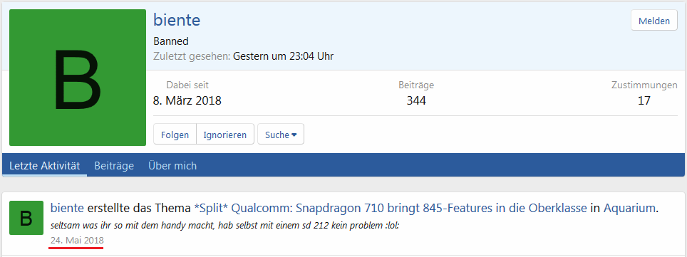 Du hattest Recht. Nur die Profilseiten permanent gesperrter Benutzer werden von XenForo gesperrt. Der genannte Nutzer ist temporär gesperrt, deshalb bleibt seine Profilseite verfügbar.Deathangel008 schrieb:daran kann das nicht liegen, der nutzer bei dem mir das aufgefallen war hatte schon mehrere beiträge im neuen forum verfasst. konkret handelt es sich um den nutzer "@biente".