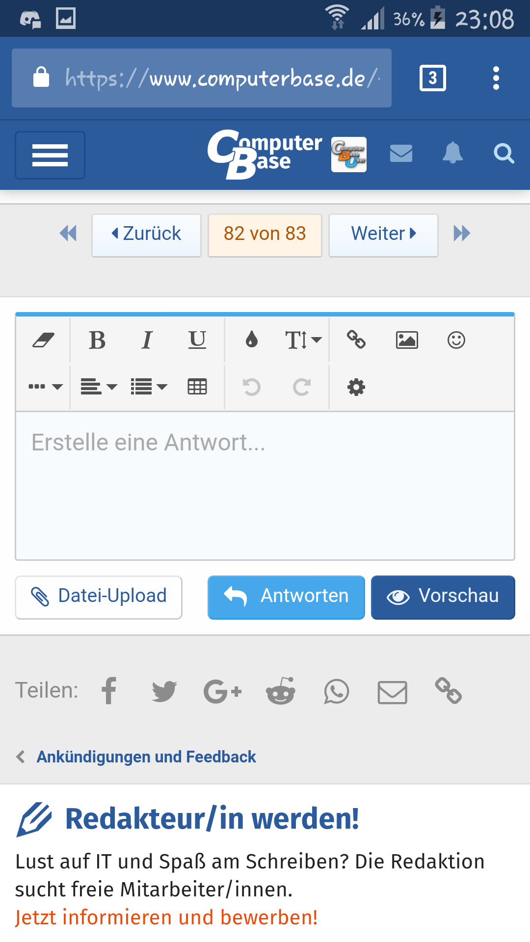 Und wie ich gerade beim Ansehen der Vorschau merke (das wurde vor ein paar Tagen schon mal angesprochen, ich finds grade aber nicht): Der Übergang von den einfügbaren Anhängen zur Vorschau des Beitrags ist praktisch nicht vorhanden... Eine deutlichere Trennung wäre mir da sehr lieb. Ggf. die Vorschau über dem Editor, dass man die Vorschau direkt im Zusammenhang mit dem letzten Post im Thread anschauen kann (so wie es ja dann auch wirklich online geht), und nicht zwischendrin der Editor und die Anhänge reingrätschen.