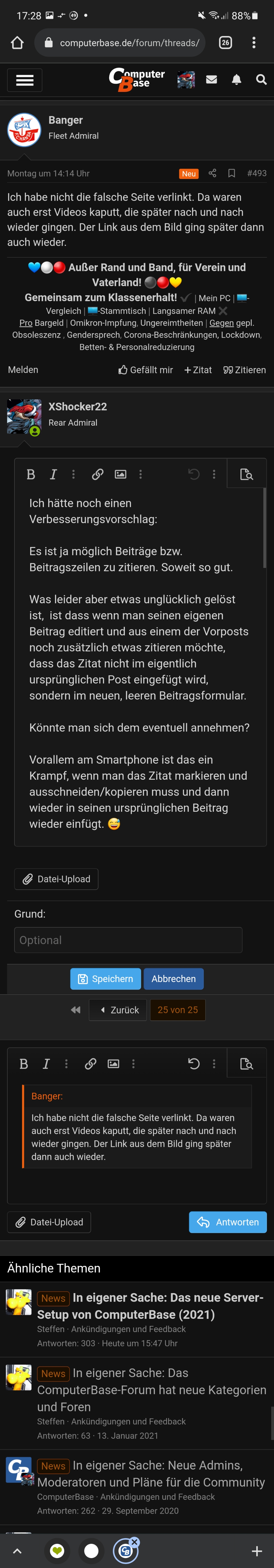 Was leider aber etwas unglücklich gelöst ist, ist dass wenn man seinen eigenen Beitrag editiert und aus einem der Vorposts noch zusätzlich etwas zitieren möchte, dass das Zitat nicht im eigentlich ursprünglichen Post eingefügt wird, sondern im neuen, leeren Beitragsformular.