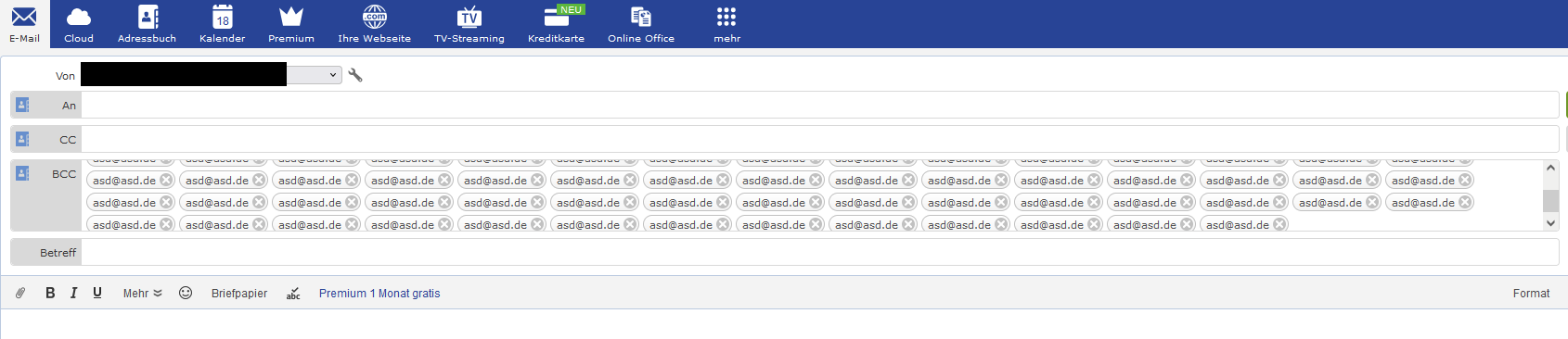 Wenn ich in dem Feld Bcc 50 verschiedene e-Mail-Adressen einfüge, dann wird das Feld "Bcc" plötzlich so groß, dass es den ganzen Text von der e-Mail verdeckt.