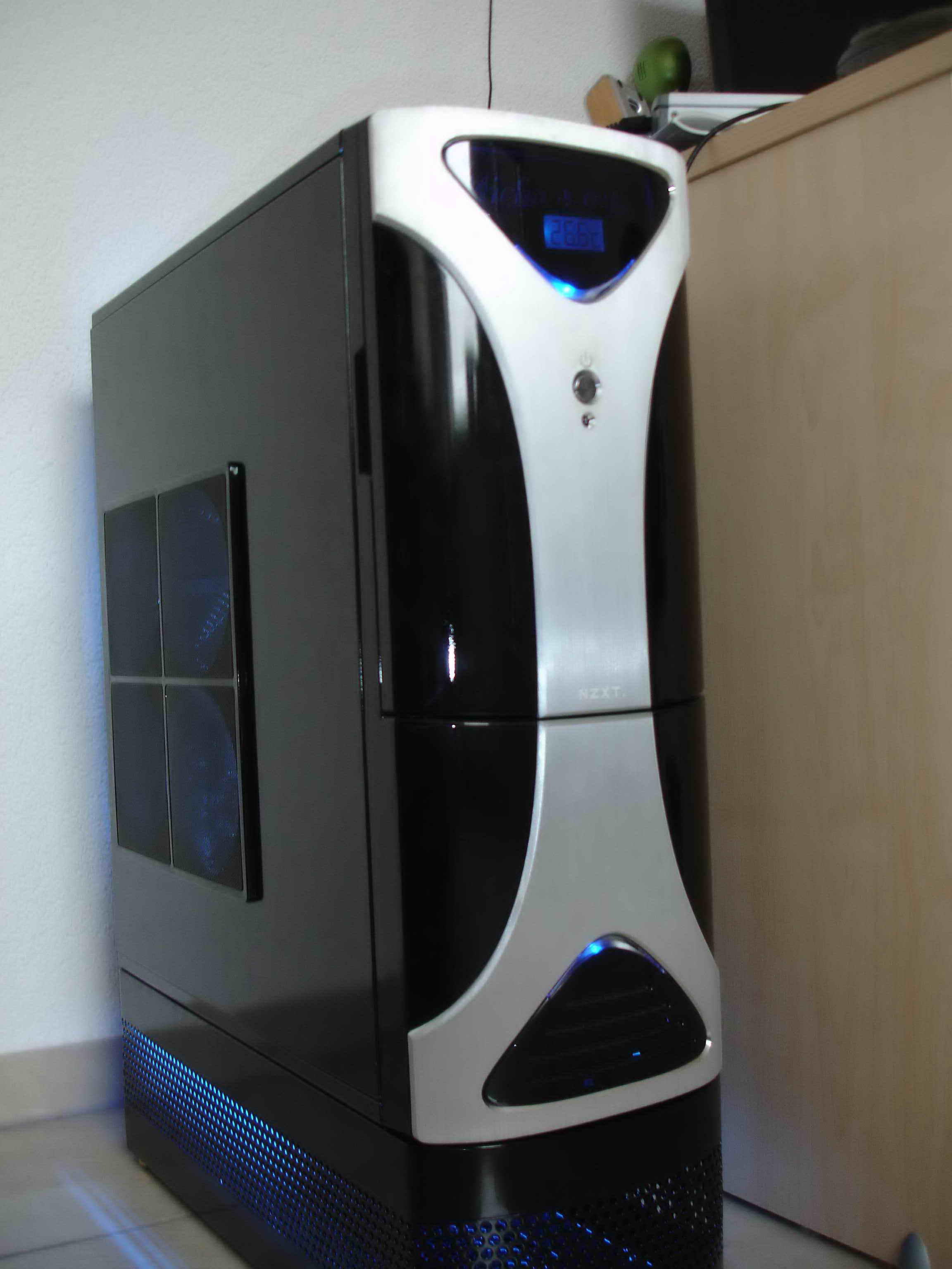 Schwarzes Gehäuse mit blauer Kathode vorne. Die LED Lüfter hab ich gegen Slipstream getauscht.