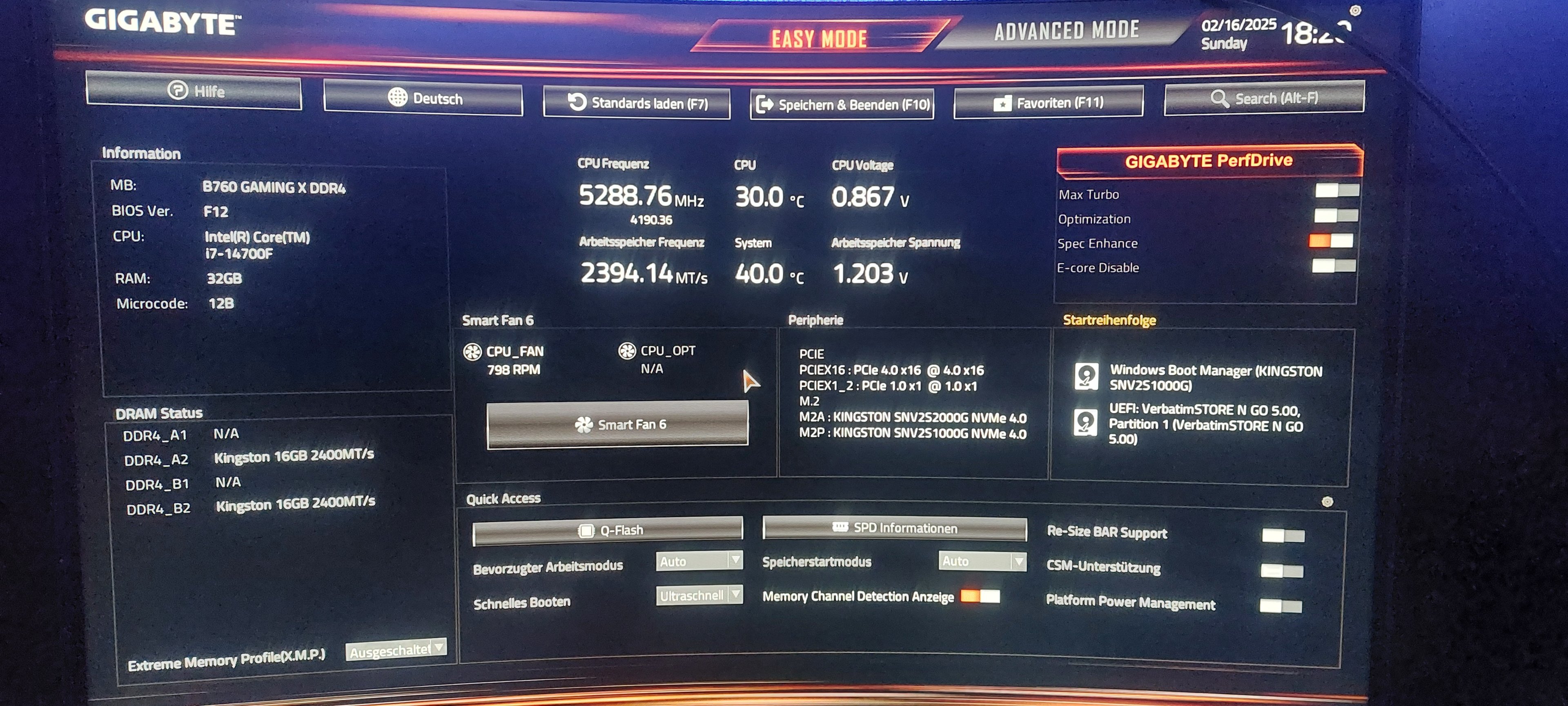 Auf der 2TB Platte liegt Windows. Ich habe bereits das BIOS auf Standardwerte gesetzt, VMD an/aus gestellt, schnelles booten aktiviert, SATA Configuration an/aus gestellt.HisN schrieb:Welche Platte bootet denn? Wie hast Du Dein Bios eingestellt?