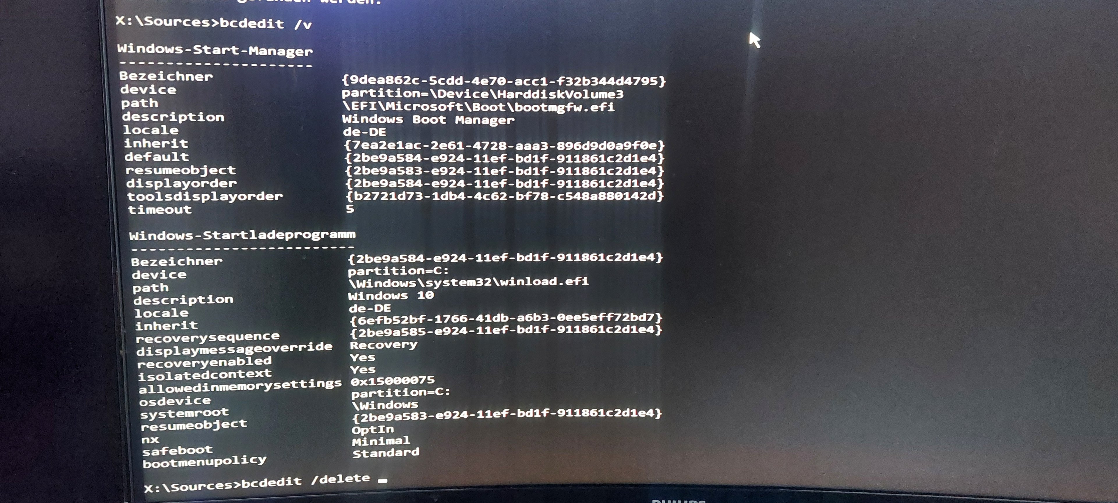 identifier " {xxxxxxx-xxxx-xxxxx-xxxxx-xxxxxxxxx} " <- den teil in bcdedit /delete als guid eintragen