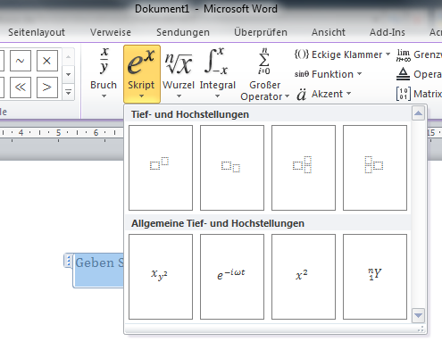oder mit dem Formeleditor (unter Einfügen ganz rechts), da steht dir alles zur Verfügung: