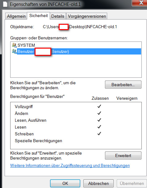 Dabei unter der Datei Eigenschaften/Sicherheit/Benutzer habe ich den Hacken bei Vollzugriff.