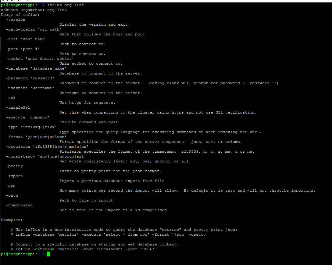 Wie kann ich commands (bspw 'influx org list' um mir alle Organisationen anzeigen zu lassen) ausführen? Wenn ich die einfach in meinem User Verzeichnis ausführen will, bekomme ich einen Fehler "unknown arguments: org list". Genauso, wenn ich die influx client shell öffne und da den command nutze.
