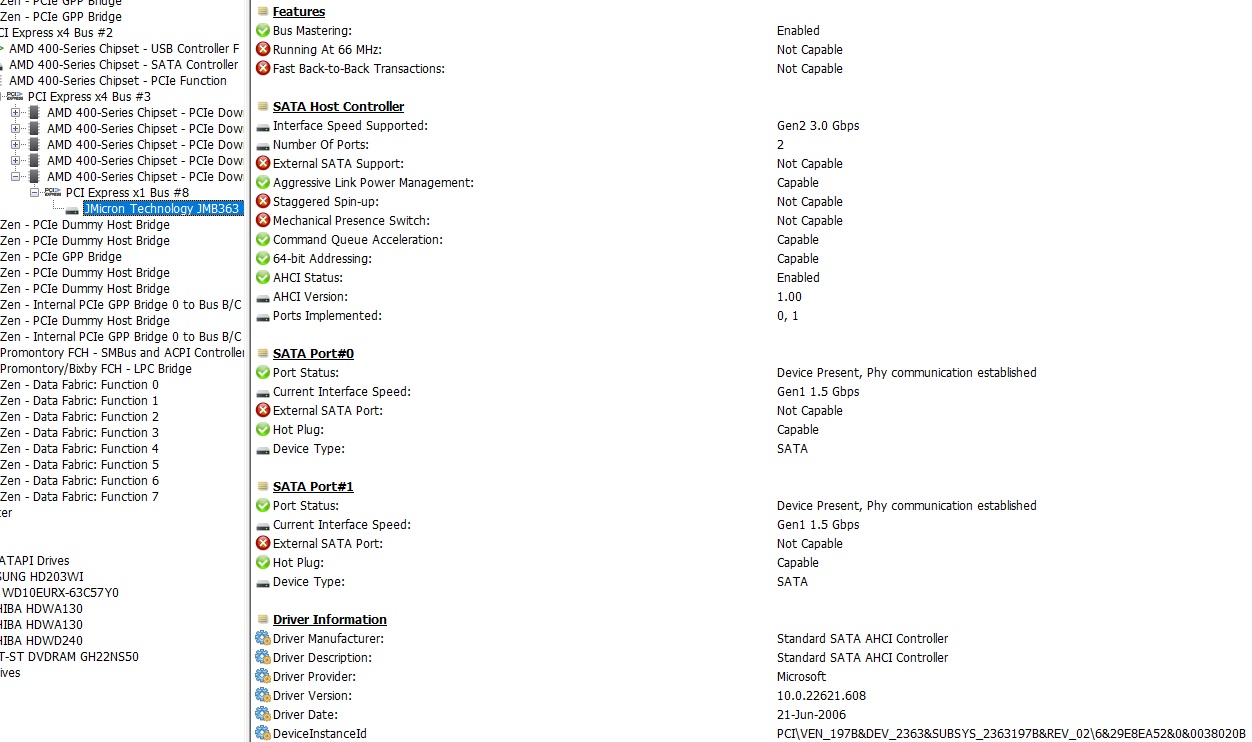 ich hatte letztens meinen antiken JMB363 von 2005 ausgegraben und mich dabei daran erinnert, dass man unter Windows auf die veralteten und recht bescheidenen JMicron-Treiber (also als RAID-Controller) angewiesen ist, obwohl der IC an sich AHCI 1.0 unterstützt. Nur scheint das im Standard-BIOS der Steckkarten deaktiviert zu sein. Für direkt auf Mainboards aufgelötete Chips gab es allerdings angepasste Versionen mit AHCI.