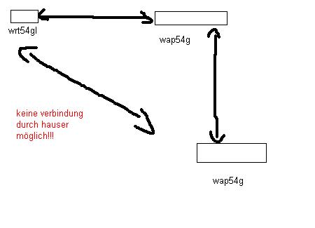Habe eine Linksys WRT54GL als router im haus daneben seht ein linksys Wap54g der als Bridge fungiert. nun wollte ich noch eine wap54g kaufen für eine kumpel der hat bolß das problem das er meinen roter nicht sieht.(siehe bild) nun wollte ich wissen ob er sich an die brige (wap54g) die im haus neben mir seht anmelden kann???? und so am ende über meinen router ins netz kommt.