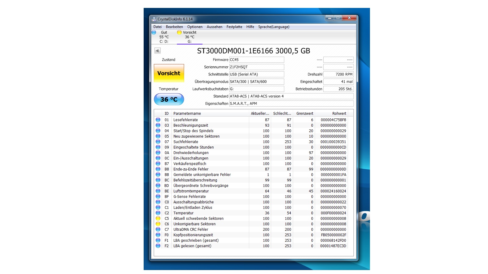 1 Suchfehler (ID 07); 13 Ende zu Ende Fehler (B8), das sind Paritätsfehler im Datenpfad zwischen Plattencache und der Platte; 506 Mal konnte die Fehlerkorrektur nicht korrigieren (BB), hier werden auch mehrfachversuche gezählt; 1 Command Timeout (BC); 8 Sektoren konnten nicht gelesen werden (C5), die wurden bei Plattenselbsttests gefunden (C6), ob diese Sektoren defekt sind und durch Reservesektoren ersetzt werden müßen zeigt sich erst nach dem nächsten Beschreiben derselben.