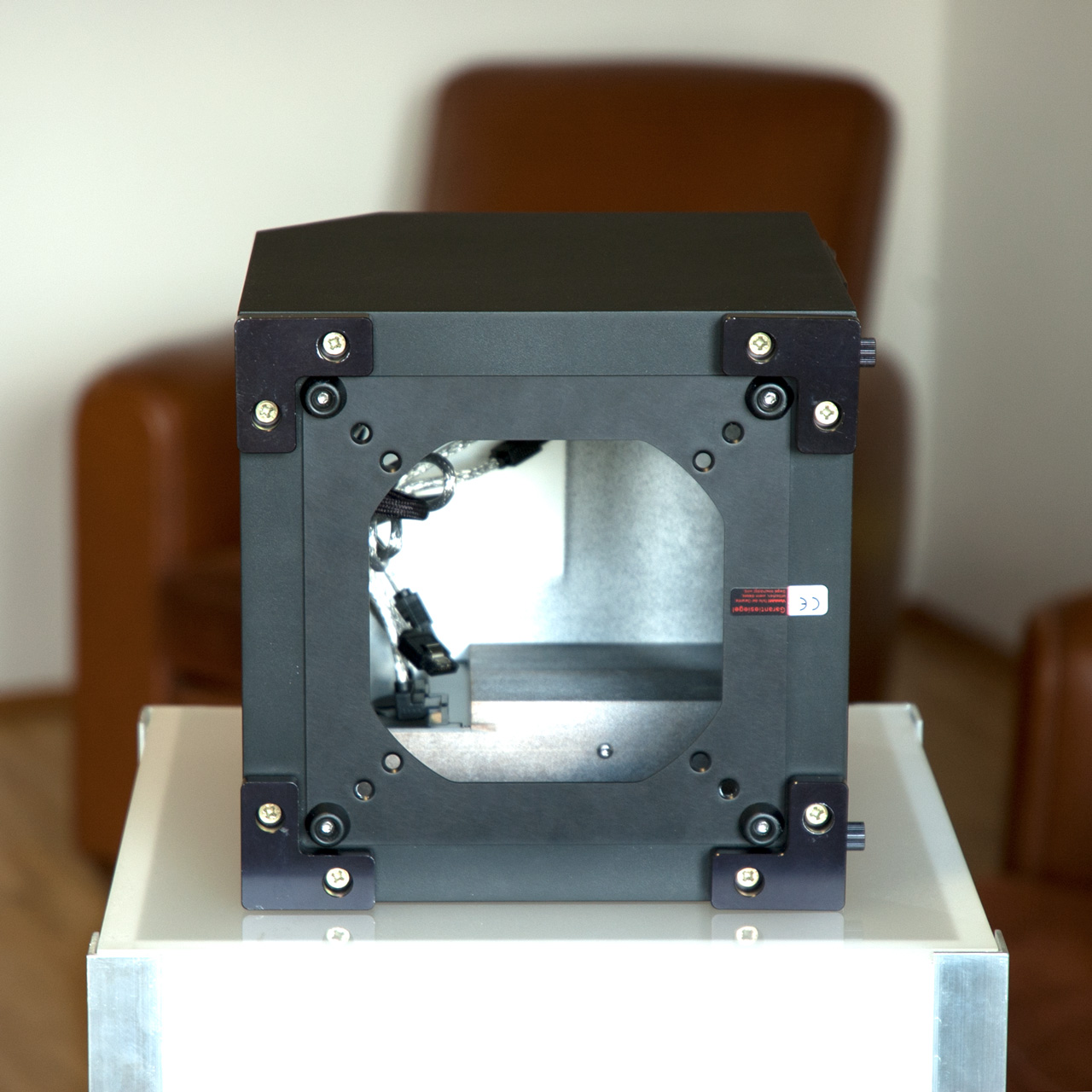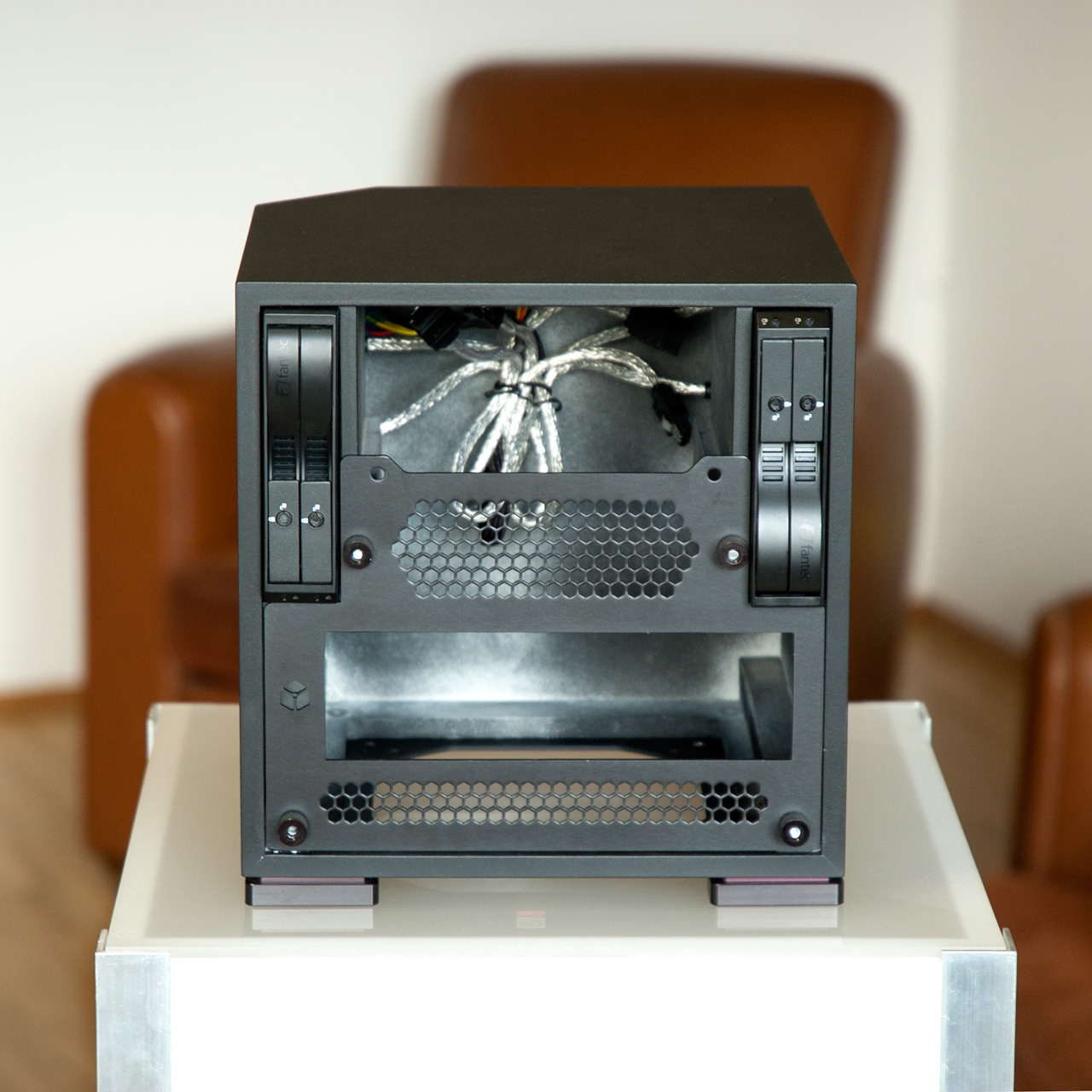 * Korpus schwarz, Ecke Plexiglas® rot, L-Füße Aluminium schwarz, Bleche schwarz, leichte Gebrauchsspuren, sehr kleine Macke rechts oben Ecke, Wechselrahmen 4x SATA 3 Gb/s