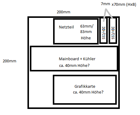 Sind die beiden Laufwerke 2,5" oder 3,5"? Denn Eigentlich ist ein 2,5"-Laufwerk doch nur 70mm Breit. Also müssten die ja nur geringfügig weiter nach unten gehen als ein SFX-Netzteil (63mm) bzw. etwas weniger nach unten als ein ATX-Netzteil (84mm). Also könnte ja der Aufbau um eine Grafikkarte ergänzt werden, oder? Dass das Ganze dann etwa so aussieht wie in meiner Skizze (nicht maßstabsgetreu). Natürlich muss noch die Materialdicke des Gehäuses und die Abstände zwischen den Bauteilen für die Luftzirkulation beachtet werden. Aber die reine Bauteilgesamthöhe müsste doch etwa bei 163mm mit einem ATX-Netzteil und 143mm mit einem SFX-Netzteil liegen. Normalerweise sollte auch noch Platz für einen kleinen Lüfter sein, um eine etwas bessere Kühlung zu gewährleisten. Der Aufbau wäre also folgender: