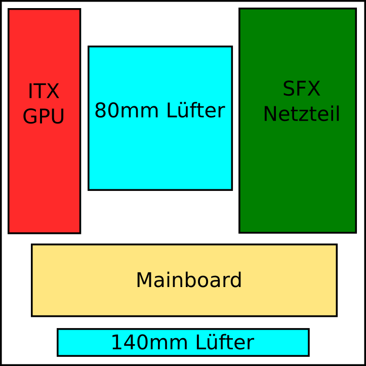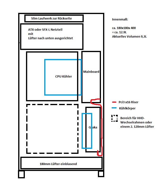 Sehe ich das richtig, dass bei deinem Vorschlag der Platz über dem Mainboard weitestgehend ungenutzt bleibt?