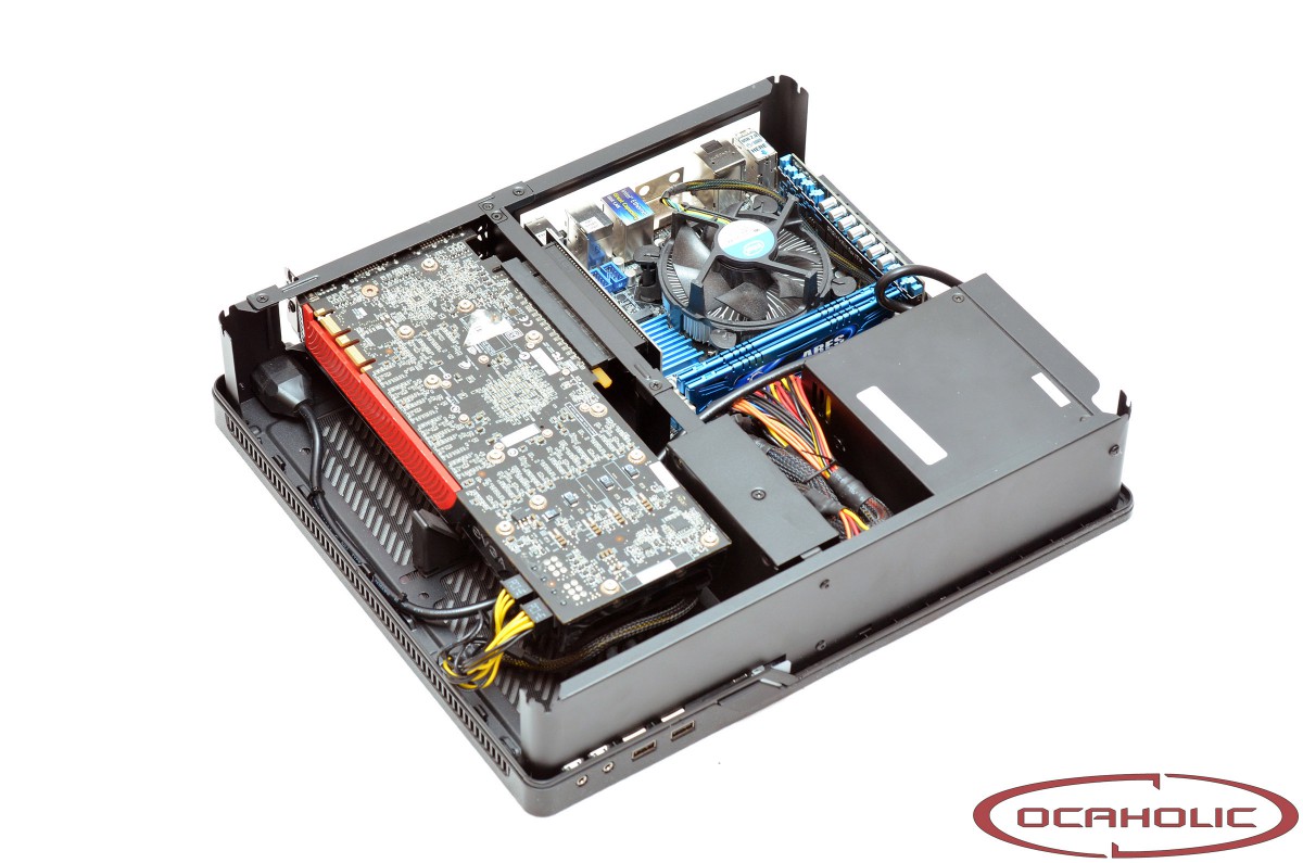 3. Dualslot-ITX-GPU mittels flexibler PCIe-Riserkarte an der linken Seite befestigen (Lüfter zeigt nach rechts)