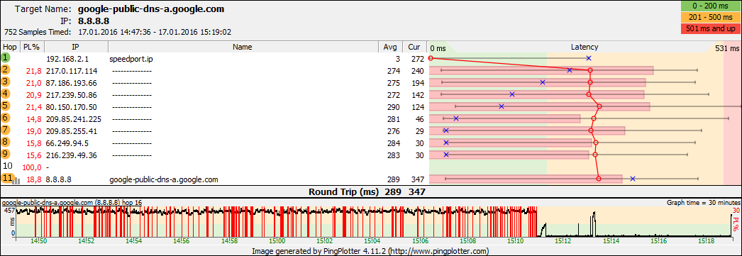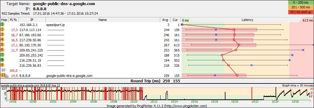ich habe seit einiger Zeit Probleme mit der DSL-Verbindung (3,4 Mbit am Router). Aufgefallen ist es zunächst durch gelegentliche hohe Latenzen in WoW und ebenfalls gelegentlichen auffällig langen Ladezeiten normalen Internetseiten wie z. B. Spiegel Online.