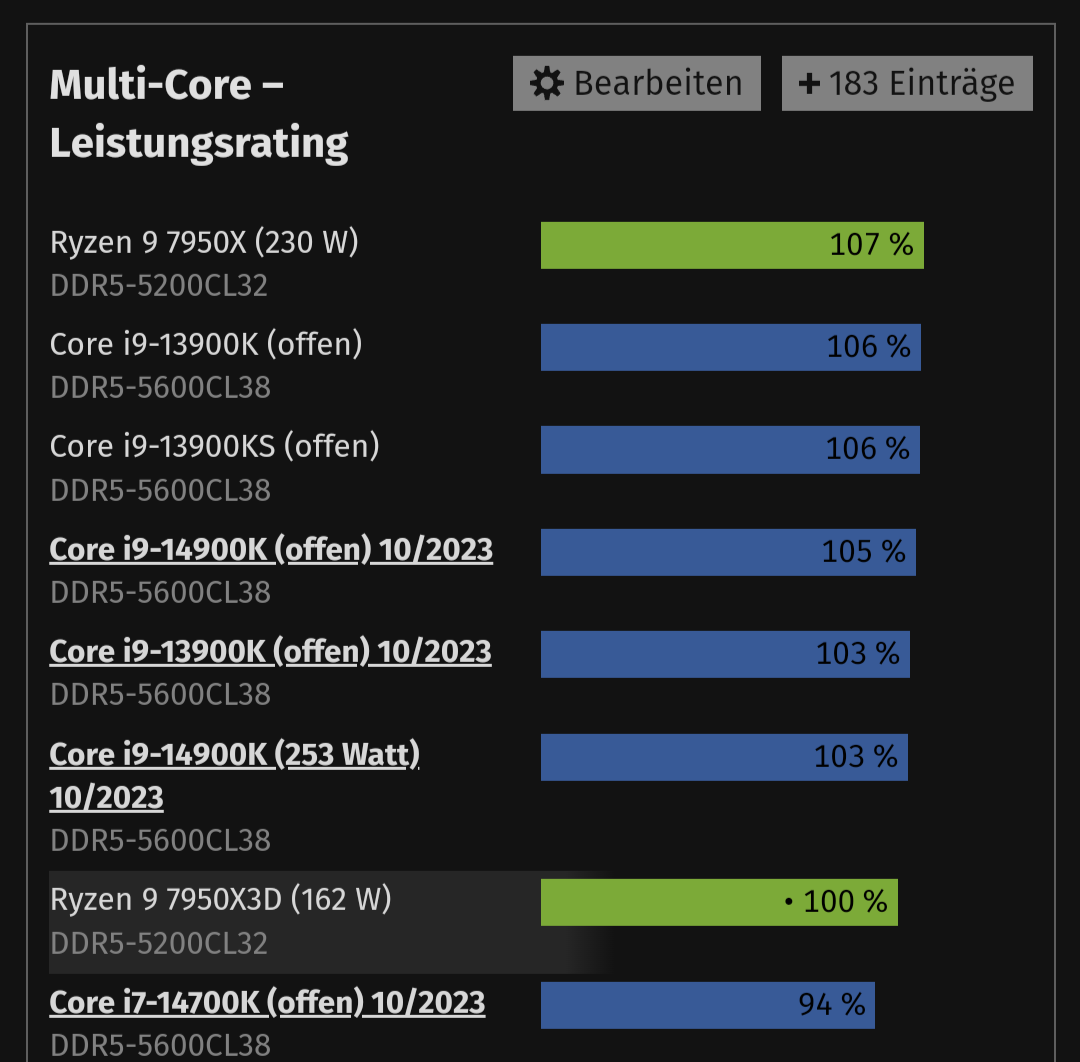 Interessant, dass der 7950X (230W) gegenüber dem 7950X3D (162W) ebenfalls nur 7% gewinnt. In der Anwendungsleistung ist X3D ja quasi nutzlos, die Skalierung ist dennoch echt schlecht. ~50% mehr Strom für 7% mehr Rechenleistung ist ein schlechter Witz und zeigt, dass auch AMD am oberen Ende der V/F Kurve operiert.