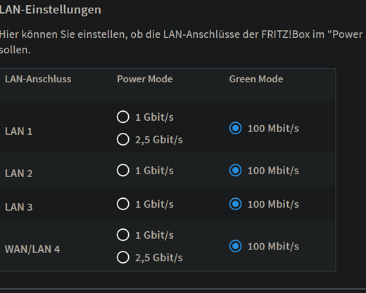 Der WAN Port wird über LAN 4 der Fritzbox mit 2,5 Gbit betrieben. Mit demselben PC und demselben Kabel cat8.1 15m tritt jedoch ein Problem auf, sobald ich auf Port 4 wechsle. Die Verbindung wird dann instabil und getrennt, es dauert dann knapp eine Minute bis die Verbindung wieder steht, das alles in einem Rhythmus von 10 min ungefähr.