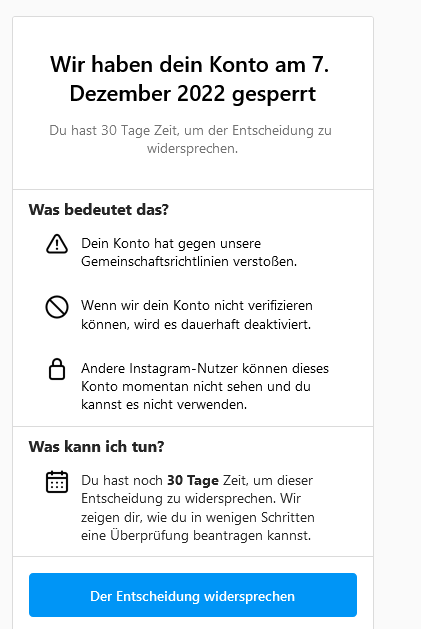 Habe es schon mit mehreren neu erstellten Mailadressen probiert, Cache und alles zurückgesetzt, Chrome sogar komplett neu installiert, benutze NordVPN auch hier neuen Ort bzw IP gewählt, Wlan neu gestartet, 2Tage gewartet, wieder probiert aber immer erkennt Instagram "mich" bzw sperrt gleich den neu erstellten Account ohne auch nur 1sek aktiv zu sein.