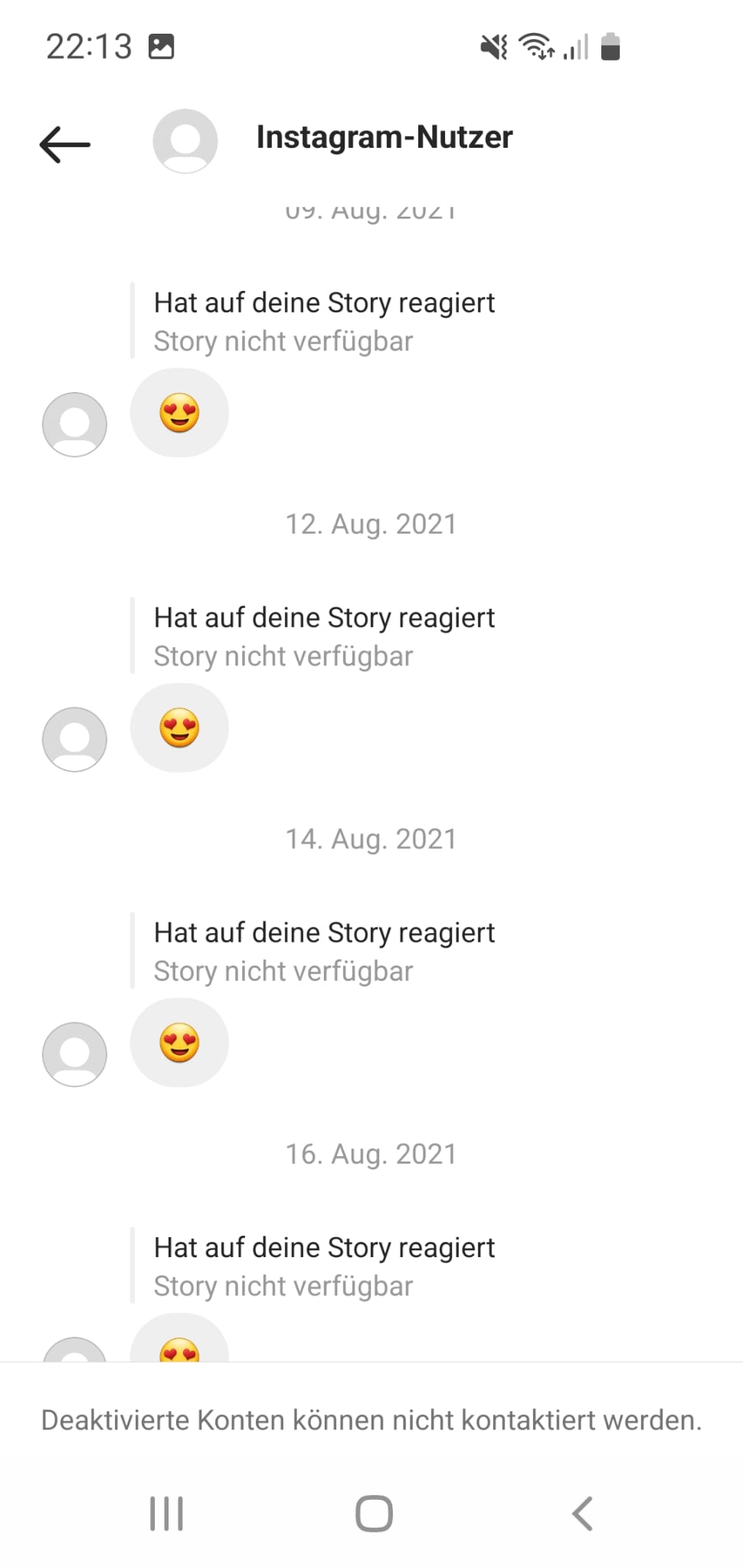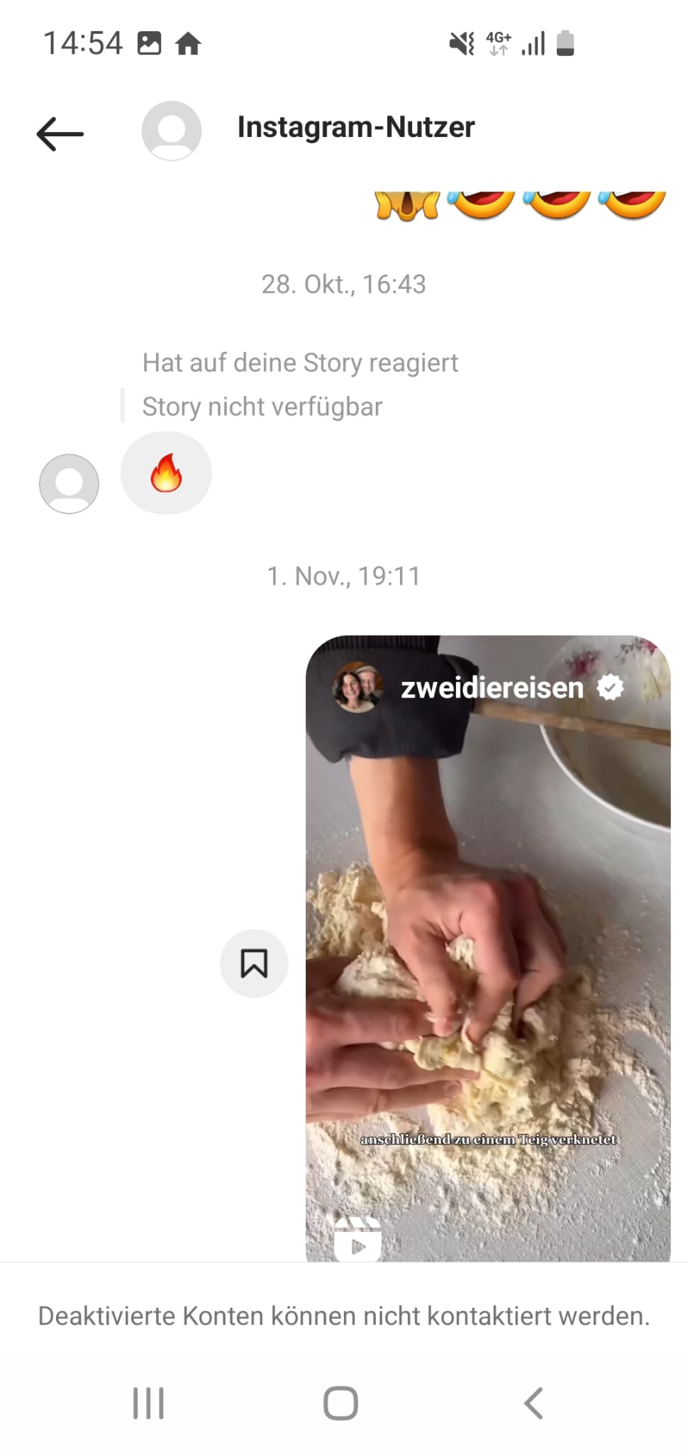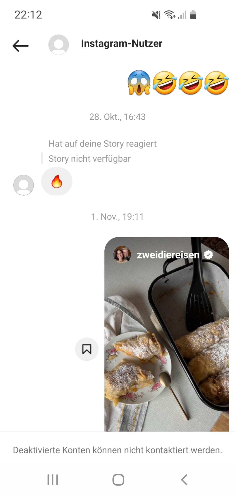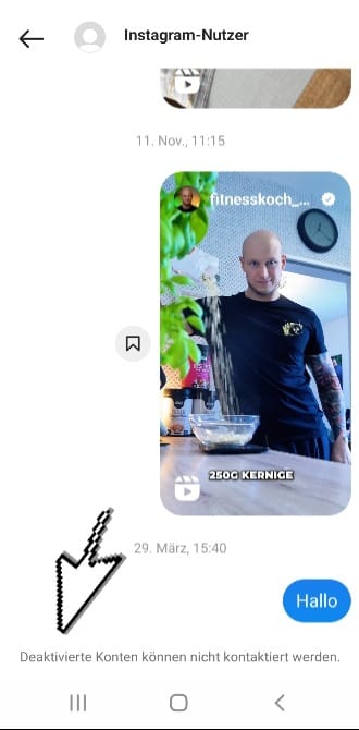 Im Instagramchat wird angezeigt, dass deaktiviert Konten nicht kontaktiert werden.