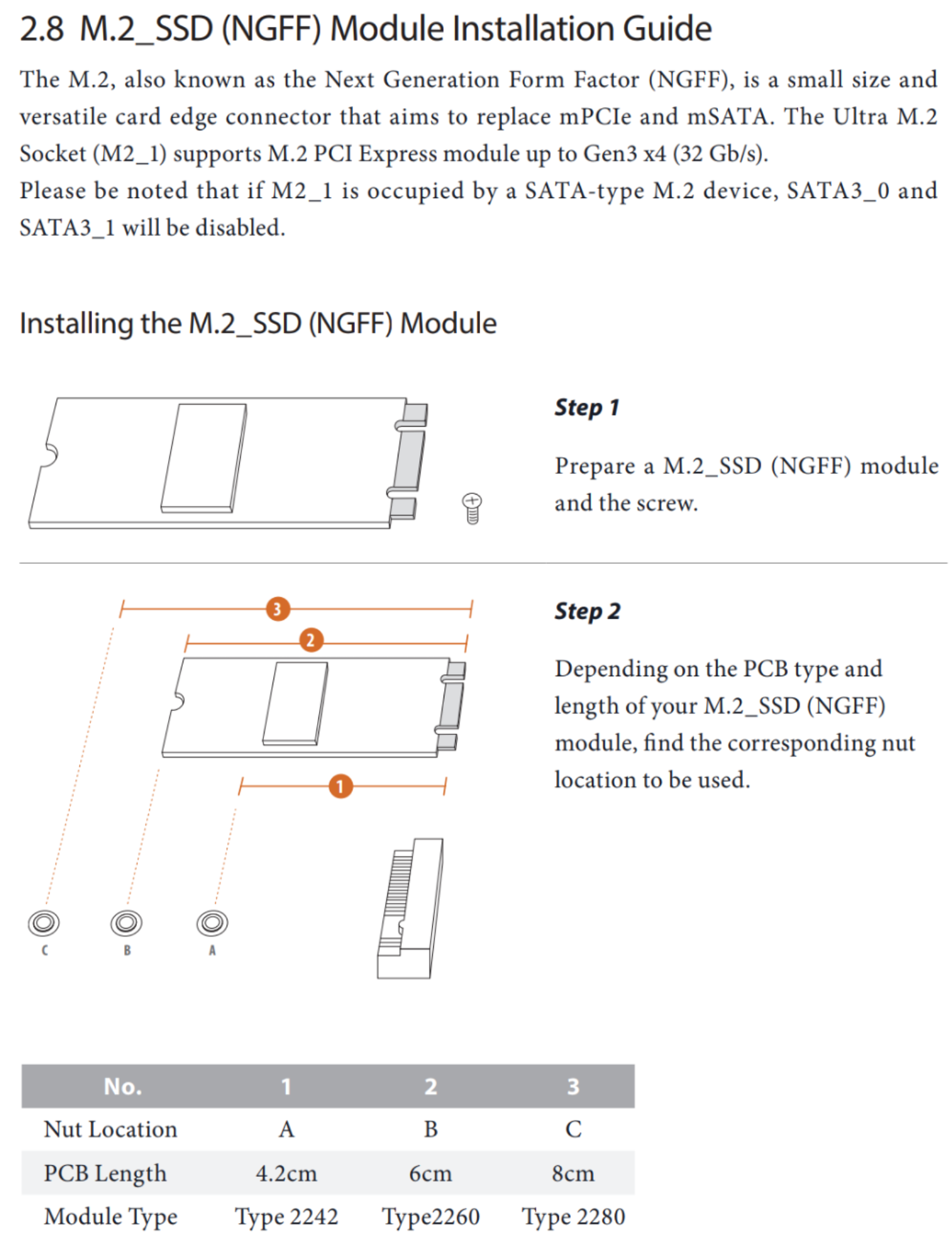 Ich habe natürlich auch mal in die Anleitung geschaut. So wie es aussieht benötige ich noch eine Art "Standoff" an der ich die SSD nachher am herausstehenden Ende mit einer Schraube fixieren muss? So ein Teil habe ich nicht. Habe noch die OVP vom Mainboard, daist höchsten noch eine winzige Schraube drin. Das könnte die benötigte Schraube sein.