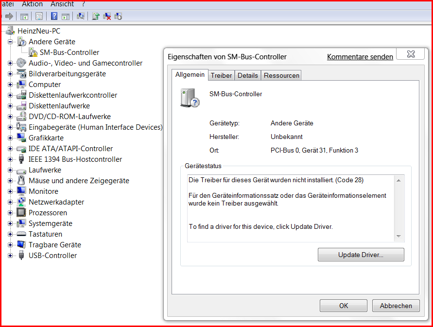 nachdem die Installtion von Windows 7 nebst diverser Treiber ein Kinderspiel gewesen ist, beschäftigt mich noch das Probelm des SM-Bus-Treibers. Die Online-Installation klappt im Gegensatz zu den anderen Treibern gar nicht.